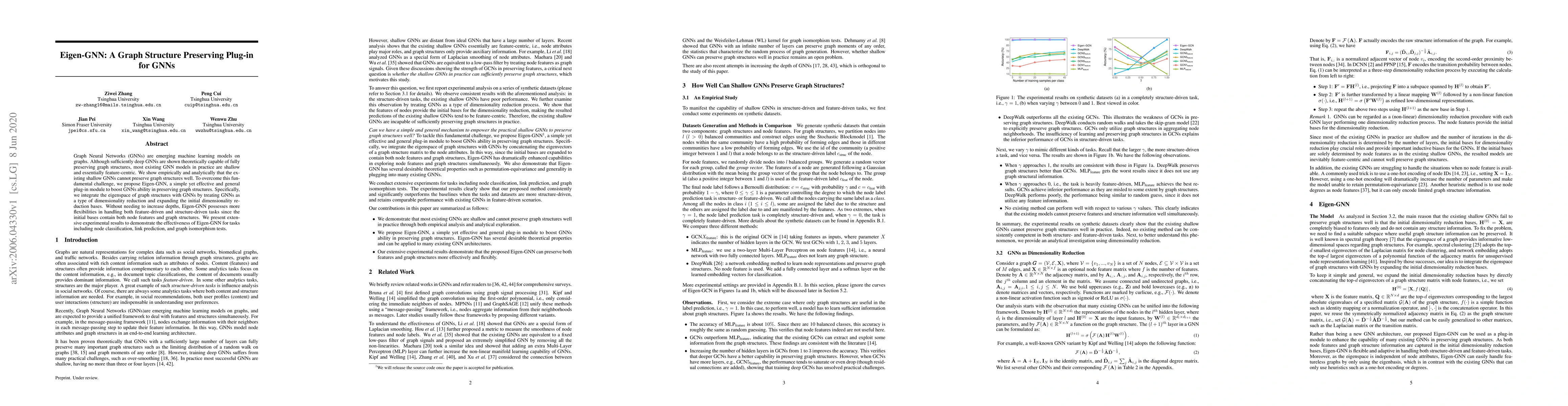 Graph Neural Networks (GNNs) are emerging machine learning models on graphs. Although sufficiently deep GNNs are shown theoretically capable of fully preserving graph structures, most existing GNN models in practice are shallow and essentially feature-centric. We show empirically and analytically that the existing shallow GNNs cannot preserve graph structures well. To overcome this fundamental challenge, we propose Eigen-GNN, a simple yet effective and general plug-in module to boost GNNs ability in preserving graph structures. Specifically, we integrate the eigenspace of graph structures with GNNs by treating GNNs as a type of dimensionality reduction and expanding the initial dimensionality reduction bases. Without needing to increase depths, Eigen-GNN possesses more flexibilities in handling both feature-driven and structure-driven tasks since the initial bases contain both node features and graph structures. We present extensive experimental results to demonstrate the effectiveness of Eigen-GNN for tasks including node classification, link prediction, and graph isomorphism tests.