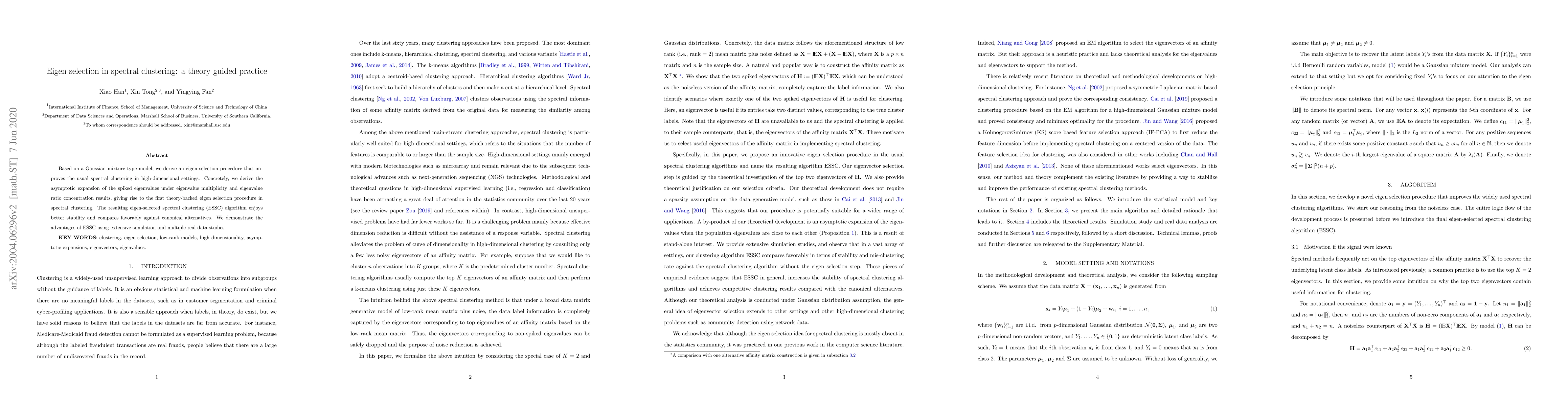 This paper proposes a theory-guided eigen selection procedure for spectral clustering based on a Gaussian mixture model, improving stability in high-dimensional settings. The new ESSC algorithm, backed by asymptotic expansions and concentration results, outperforms traditional methods in both simulations and real data applications.