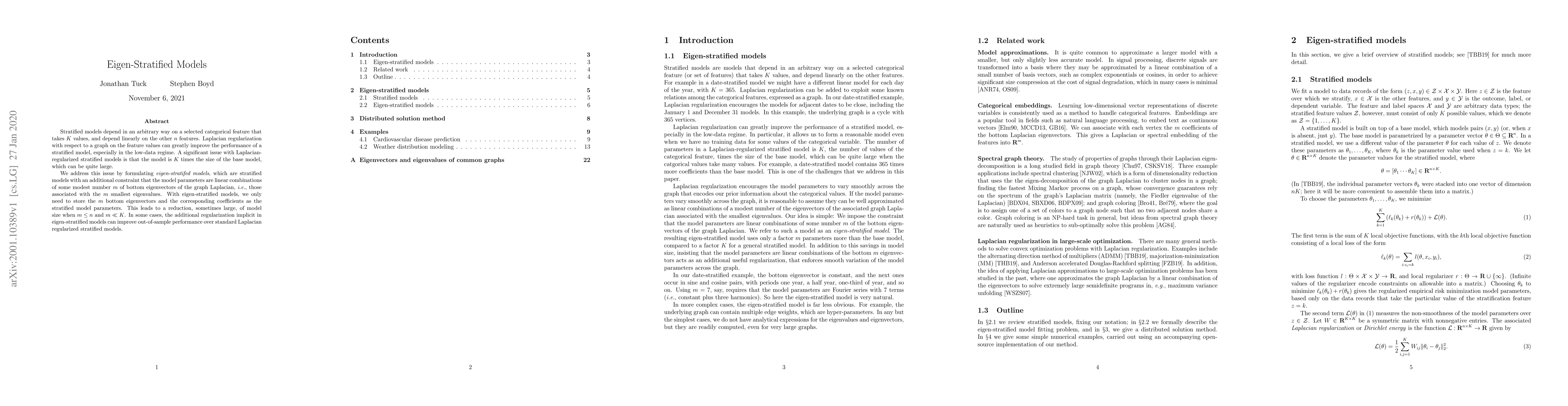 Stratified models depend in an arbitrary way on a selected categorical feature that takes $K$ values, and depend linearly on the other $n$ features. Laplacian regularization with respect to a graph on the feature values can greatly improve the performance of a stratified model, especially in the low-data regime. A significant issue with Laplacian-regularized stratified models is that the model is $K$ times the size of the base model, which can be quite large. We address this issue by formulating eigen-stratifed models, which are stratified models with an additional constraint that the model parameters are linear combinations of some modest number $m$ of bottom eigenvectors of the graph Laplacian, i.e., those associated with the $m$ smallest eigenvalues. With eigen-stratified models, we only need to store the $m$ bottom eigenvectors and the corresponding coefficients as the stratified model parameters. This leads to a reduction, sometimes large, of model size when $m \leq n$ and $m \ll K$. In some cases, the additional regularization implicit in eigen-stratified models can improve out-of-sample performance over standard Laplacian regularized stratified models.