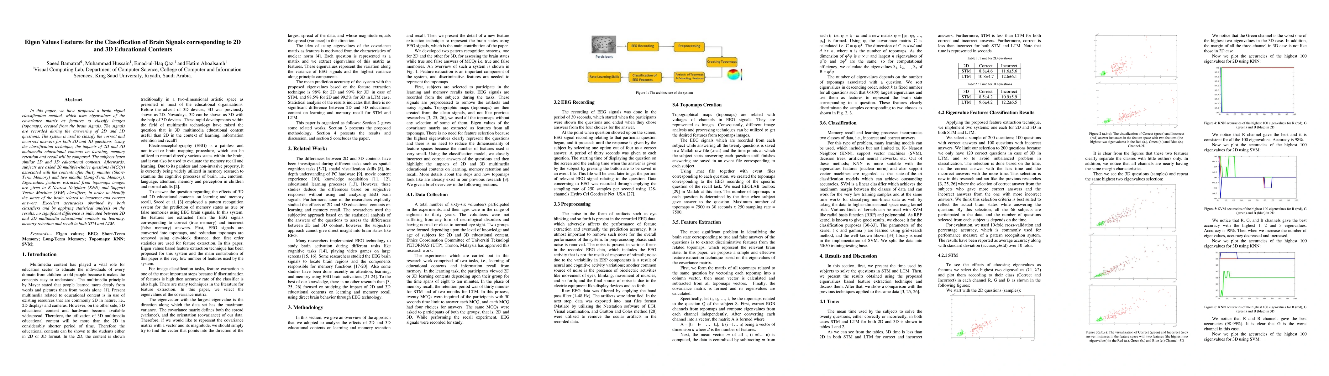 In this paper, we have proposed a brain signal classification method, which uses eigenvalues of the covariance matrix as features to classify images (topomaps) created from the brain signals. The signals are recorded during the answering of 2D and 3D questions. The system is used to classify the correct and incorrect answers for both 2D and 3D questions. Using the classification technique, the impacts of 2D and 3D multimedia educational contents on learning, memory retention and recall will be compared. The subjects learn similar 2D and 3D educational contents. Afterwards, subjects are asked 20 multiple-choice questions (MCQs) associated with the contents after thirty minutes (Short-Term Memory) and two months (Long-Term Memory). Eigenvalues features extracted from topomaps images are given to K-Nearest Neighbor (KNN) and Support Vector Machine (SVM) classifiers, in order to identify the states of the brain related to incorrect and correct answers. Excellent accuracies obtained by both classifiers and by applying statistical analysis on the results, no significant difference is indicated between 2D and 3D multimedia educational contents on learning, memory retention and recall in both STM and LTM.
