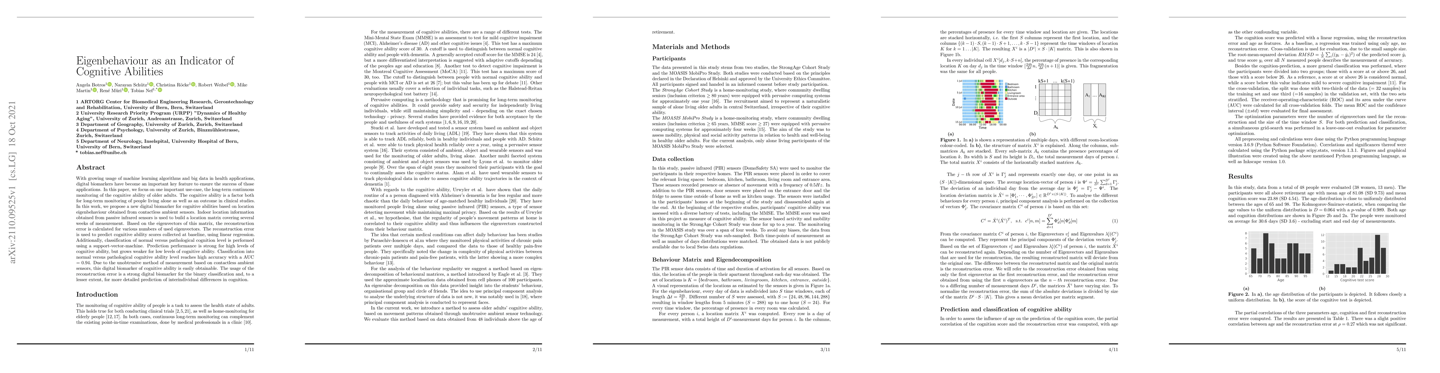 With growing usage of machine learning algorithms and big data in health applications, digital biomarkers have become an important key feature to ensure the success of those applications. In this paper, we focus on one important use-case, the long-term continuous monitoring of the cognitive ability of older adults. The cognitive ability is a factor both for long-term monitoring of people living alone as well as an outcome in clinical studies. In this work, we propose a new digital biomarker for cognitive abilities based on location eigenbehaviour obtained from contactless ambient sensors. Indoor location information obtained from passive infrared sensors is used to build a location matrix covering several weeks of measurement. Based on the eigenvectors of this matrix, the reconstruction error is calculated for various numbers of used eigenvectors. The reconstruction error is used to predict cognitive ability scores collected at baseline, using linear regression. Additionally, classification of normal versus pathological cognition level is performed using a support-vector-machine. Prediction performance is strong for high levels of cognitive ability, but grows weaker for low levels of cognitive ability. Classification into normal versus pathological cognitive ability level reaches high accuracy with a AUC = 0.94. Due to the unobtrusive method of measurement based on contactless ambient sensors, this digital biomarker of cognitive ability is easily obtainable. The usage of the reconstruction error is a strong digital biomarker for the binary classification and, to a lesser extent, for more detailed prediction of interindividual differences in cognition.