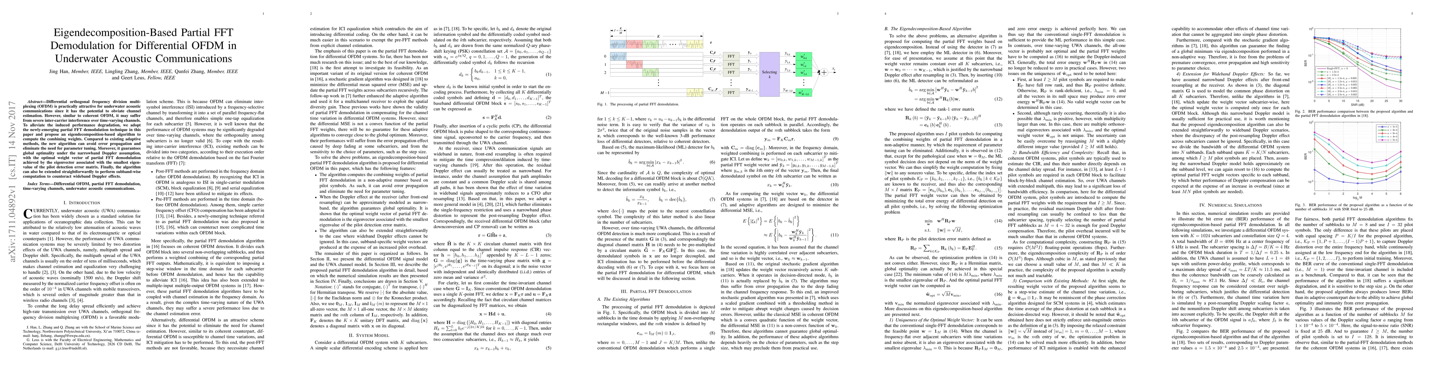 This paper proposes an eigendecomposition-based partial FFT demodulation technique for differential OFDM in underwater acoustic communications to mitigate inter-carrier interference. The new algorithm avoids error propagation, eliminates parameter tuning, and guarantees global optimality under narrowband Doppler conditions.