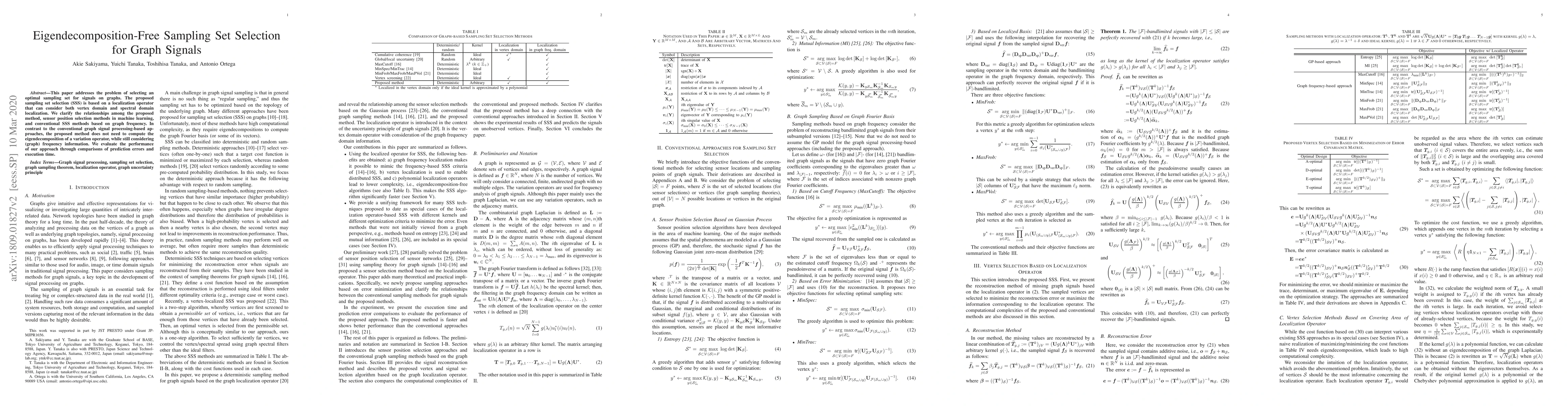 This paper proposes an eigendecomposition-free method for selecting an optimal sampling set for graph signals, utilizing a localization operator that considers both vertex and spectral domain localization without requiring eigendecomposition. The method is compared against conventional approaches based on prediction errors and execution time.