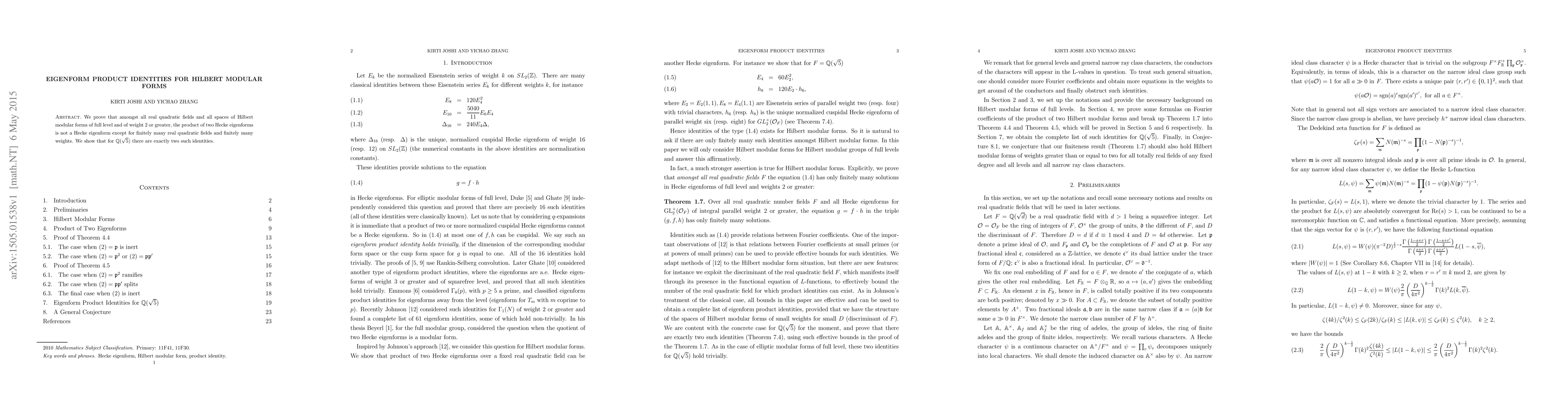 This paper proves that the product of two Hecke eigenforms in Hilbert modular forms of full level and weight $2$ or greater is not generally an eigenform, except for specific cases in certain real quadratic fields and weights, notably highlighting $\mathbb Q(\sqrt{5})$ with exactly two such identities.