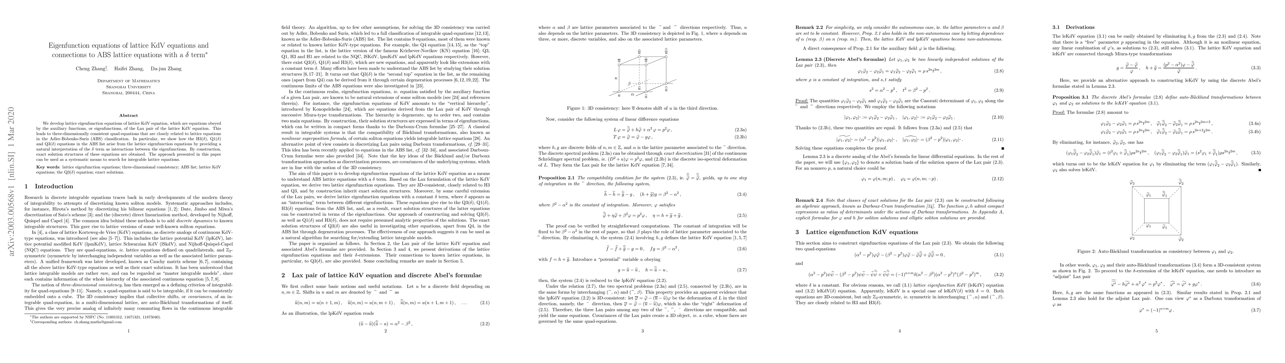 This paper develops lattice eigenfunction equations for the lattice KdV equation, linking them to three-dimensionally consistent quad-equations in the ABS classification, specifically the H3($\delta$), Q1($\delta$), and Q3($\delta$) equations, which arise from eigenfunction interactions. The method provides exact solution structures and a systematic approach to finding integrable lattice equations.