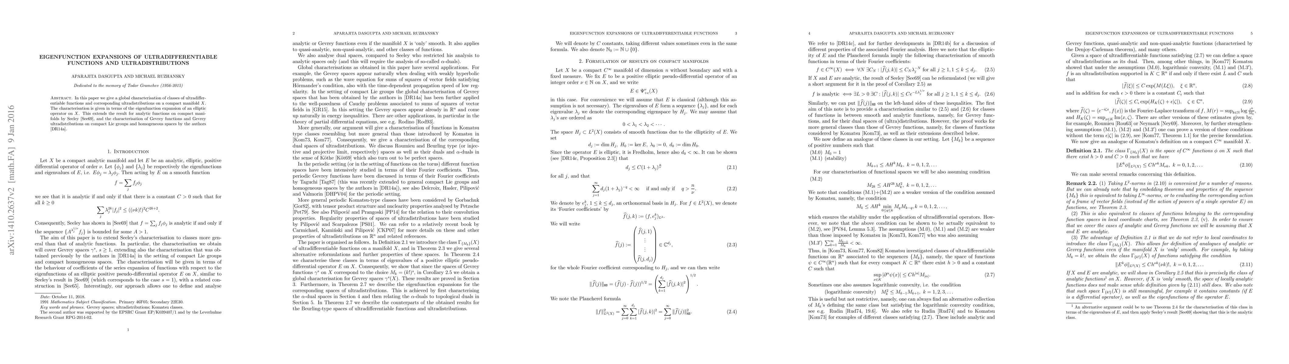 This paper provides a global characterization of ultradifferentiable functions and ultradistributions on a compact manifold $X$ using eigenfunction expansions of an elliptic operator. This extends previous results for analytic functions and Gevrey classes.