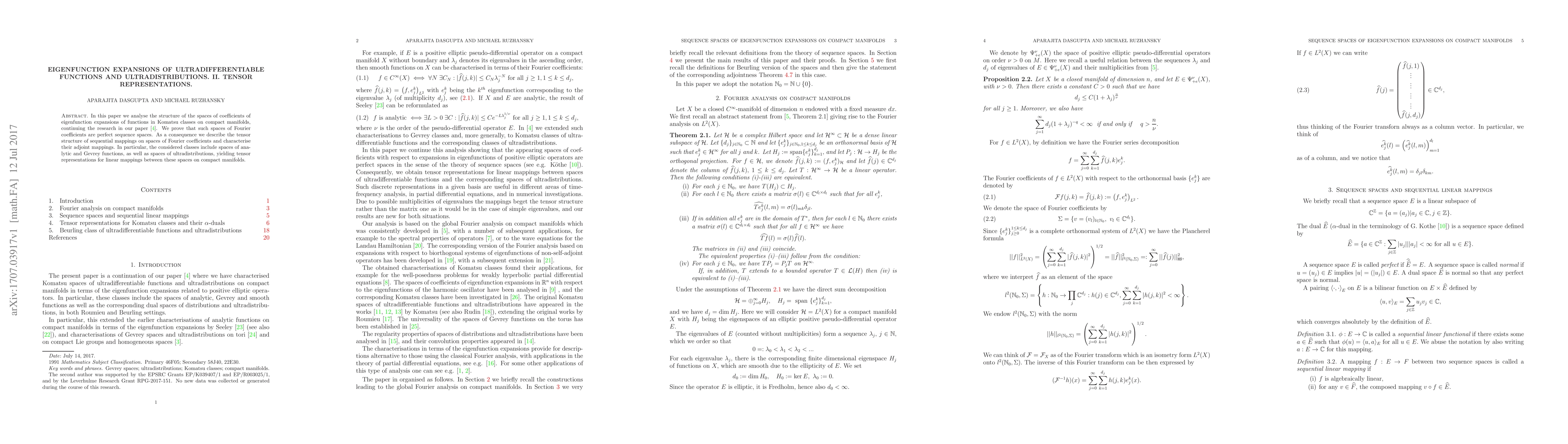 This paper investigates the eigenfunction expansions of ultradifferentiable functions and ultradistributions on compact manifolds, proving that the spaces of Fourier coefficients are perfect sequence spaces. It further characterizes the tensor structure of mappings and their adjoints, providing tensor representations for linear mappings between these function spaces.