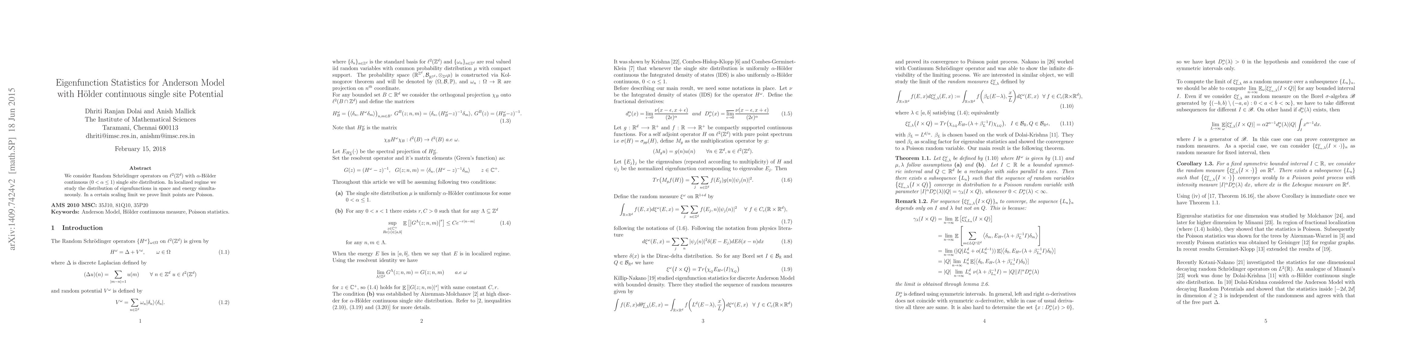 We consider random Schr\"{o}dinger operators on $\ell^2(\mathbb{Z}^d)$ when the distribution of single site potentials is $\alpha$-H\"{o}lder continuous ($0<\alpha\leq 1$). In localized regime we study the distribution of eigenfunctions simultaneously in space and energy. In a certain scaling limit we prove limits point are Poisson.
