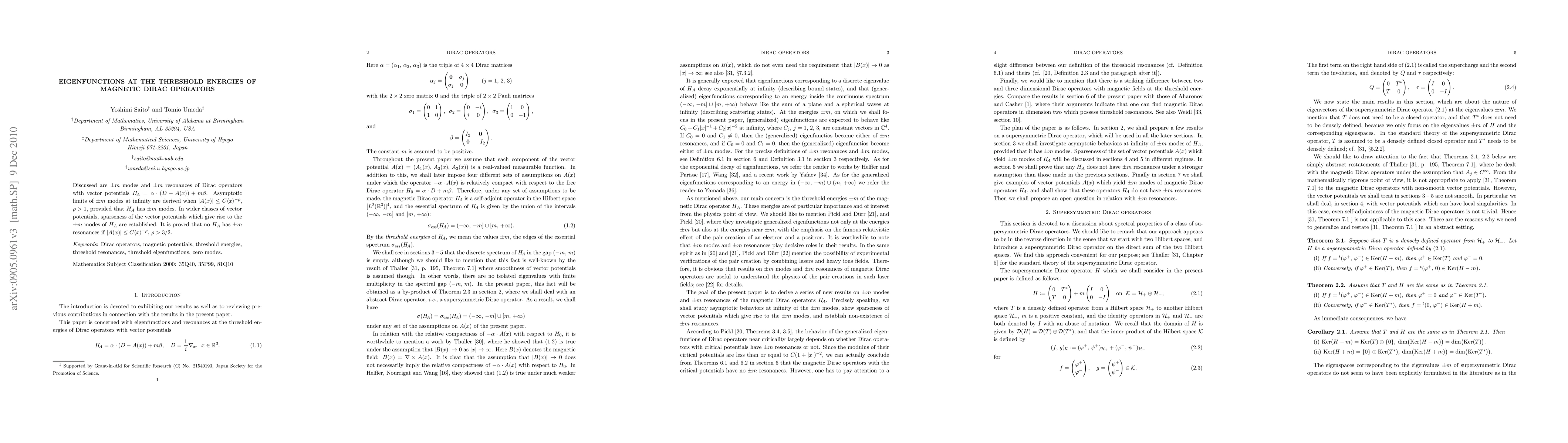 The paper presents rigorous mathematical proofs for the existence and properties of $\pm m$ modes and resonances in magnetic Dirac operators, extending previous results by Saito and Umeda.