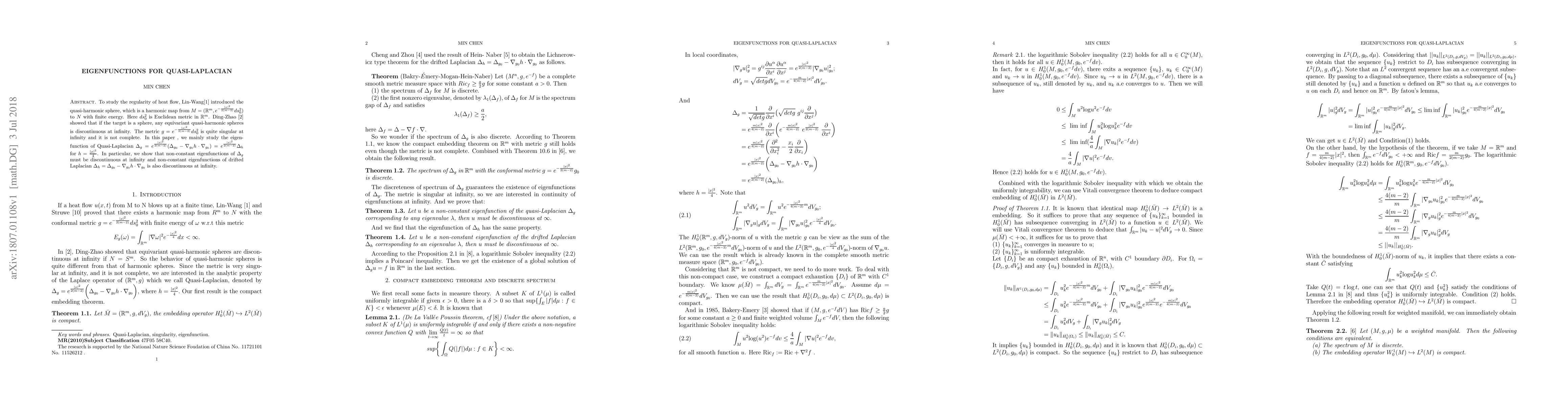 To study the regularity of heat flow, Lin-Wang[1] introduced the quasi-harmonic sphere, which is a harmonic map from $M=(\mathbb{R}^m,e^{-\frac{|x|^2}{2(m-2)}}ds_0^2)$ to $N$ with finite energy. Here $ds_0^2$ is Euclidean metric in $\mathbb{R}^m$. Ding-Zhao [2] showed that if the target is a sphere, any equivariant quasi-harmonic spheres is discontinuous at infinity. The metric $g=e^{-\frac{|x|^2}{2(m-2)}}ds_0^2$ is quite singular at infinity and it is not complete. In this paper , we mainly study the eigenfunction of Quasi-Laplacian $\Delta_g=e^{\frac{|x|^2}{2(m-2)}} ( \Delta_{g_0} - \nabla_{g_0}h\cdot \nabla_{g_0}) =e^{\frac{|x|^2}{2(m-2)}} \Delta_h$ for $h=\frac{|x|^2}{4}$. In particular, we show that non-constant eigenfunctions of $\Delta_g$ must be discontinuous at infinity and non-constant eigenfunctions of drifted Laplacian $\Delta_h=\Delta_{g_0} - \nabla_{g_0} h\cdot \nabla_{g_0}$ is also discontinuous at infinity.