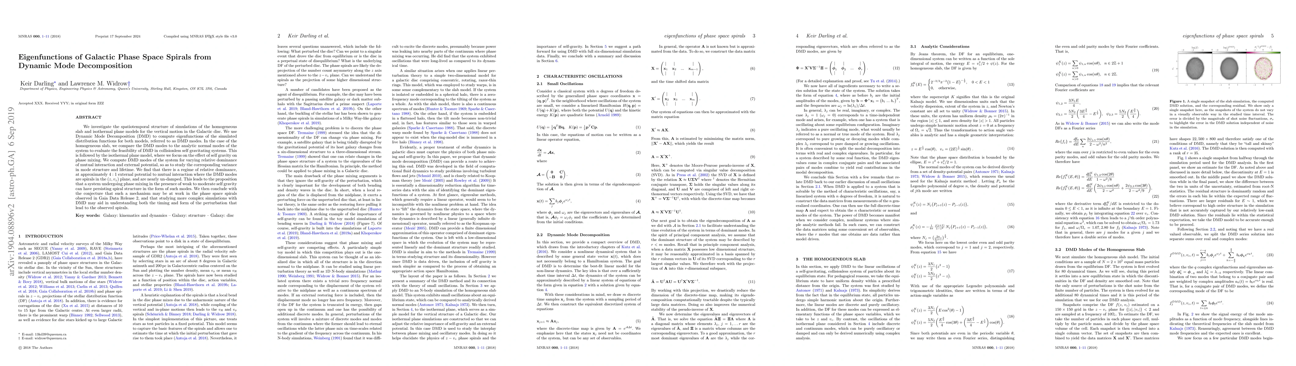 We investigate the spatiotemporal structure of simulations of the homogeneous slab and isothermal plane models for the vertical motion in the Galactic disc. We use Dynamic Mode Decomposition (DMD) to compute eigenfunctions of the simulated distribution functions for both models, referred to as DMD modes. In the case of the homogeneous slab, we compare the DMD modes to the analytic normal modes of the system to evaluate the feasibility of DMD in collisionless self gravitating systems. This is followed by the isothermal plane model, where we focus on the effect of self gravity on phase mixing. We compute DMD modes of the system for varying relative dominance of mutual interaction and external potential, so as to study the corresponding variance in mode structure and lifetime. We find that there is a regime of relative dominance, at approximately $ 4:1 $ external potential to mutual interaction where the DMD modes are spirals in the $ (z,v_z) $ plane, and are nearly un-damped. This leads to the proposition that a system undergoing phase mixing in the presence of weak to moderate self gravity can have persisting spiral structure in the form of such modes. We then conclude with the conjecture that such a mechanism may be at work in the phase space spirals observed in Gaia Data Release 2, and that studying more complex simulations with DMD may aid in understanding both the timing and form of the perturbation that lead to the observed spirals.