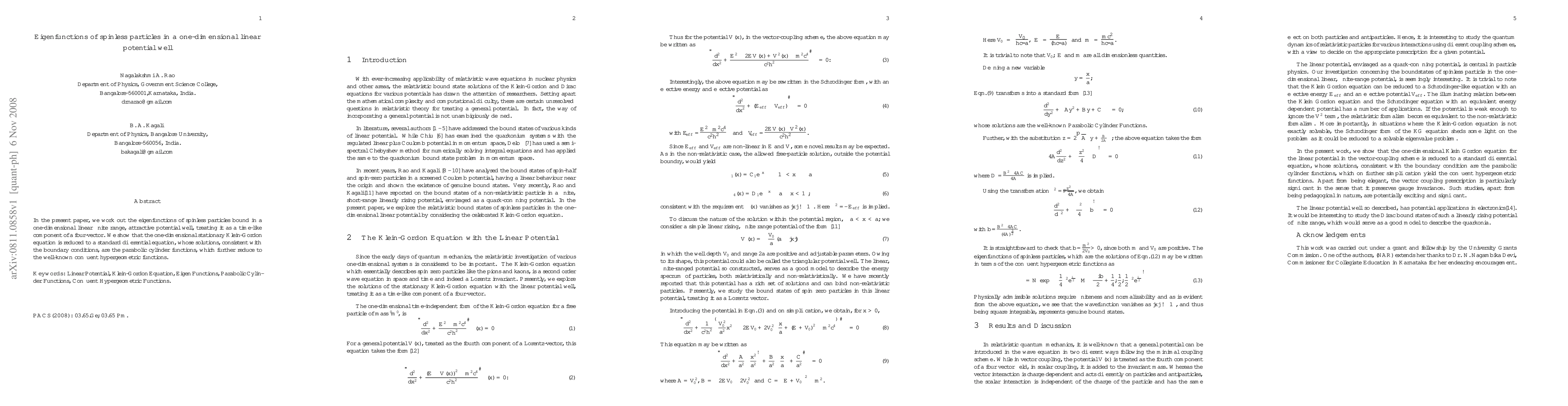 This paper derives the eigenfunctions of spinless particles in a one-dimensional linear potential well by solving the one-dimensional stationary Klein-Gordon equation, which reduces to a standard differential equation whose solutions are parabolic cylinder functions, specifically confluent hypergeometric functions.