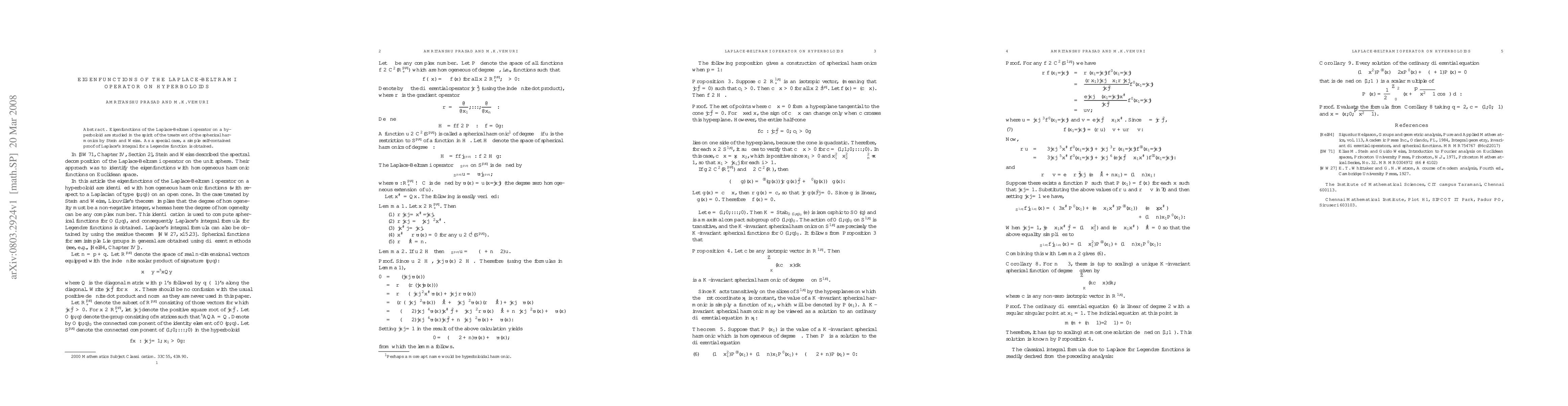The paper studies eigenfunctions of the Laplace-Beltrami operator on hyperboloids, employing a treatment similar to Stein and Weiss' approach to spherical harmonics. It provides a simple proof for Laplace's integral involving Legendre functions as a special case.
