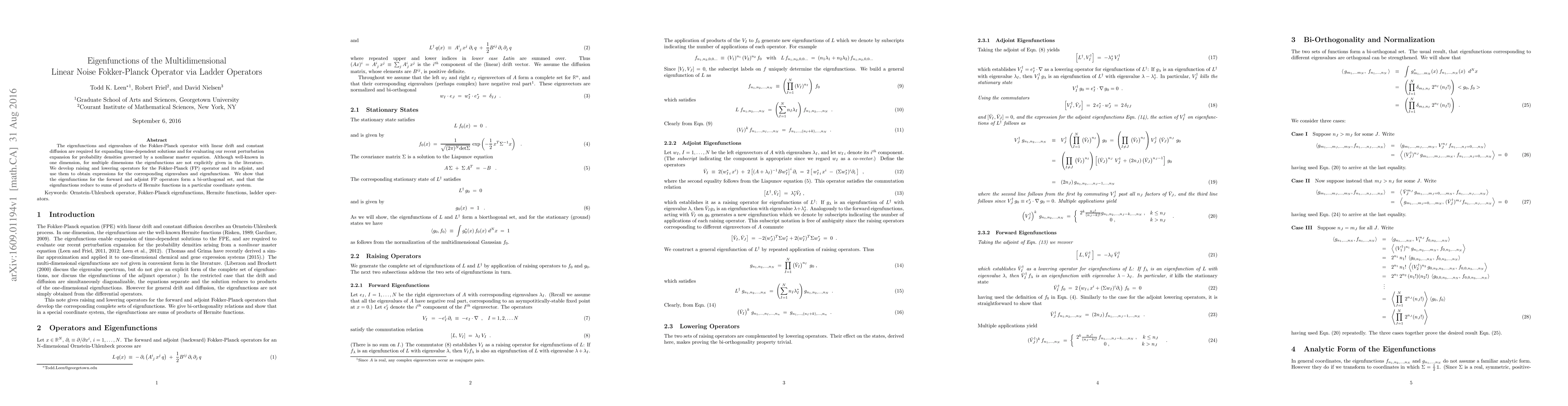 The eigenfunctions and eigenvalues of the Fokker-Planck operator with linear drift and constant diffusion are required for expanding time-dependent solutions and for evaluating our recent perturbation expansion for probability densities governed by a nonlinear master equation. Although well-known in one dimension, for multiple dimensions the eigenfunctions are not explicitly given in the literature. We develop raising and lowering operators for the Fokker-Planck (FP) operator and its adjoint, and use them to obtain expressions for the corresponding eigenvalues and eigenfunctions. We show that the eigenfunctions for the forward and adjoint FP operators form a bi-orthogonal set, and that the eigenfunctions reduce to sums of products of Hermite functions in a particular coordinate system.