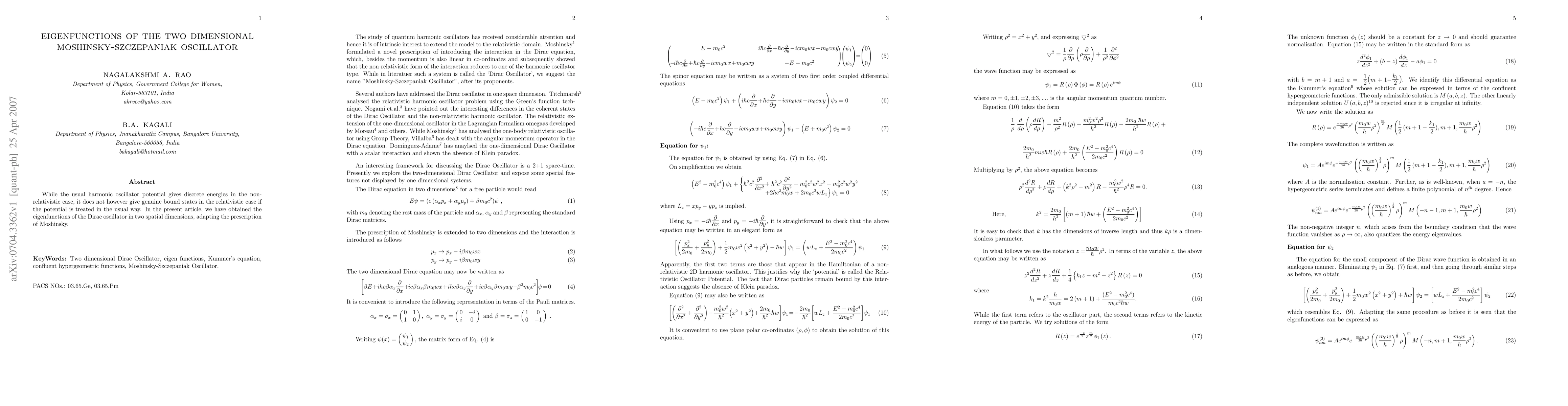This paper derives the eigenfunctions for the Dirac oscillator in two spatial dimensions, addressing the issue that the standard harmonic oscillator potential fails to provide genuine bound states in relativistic scenarios. The methodology adapts the Moshinsky prescription for this purpose.