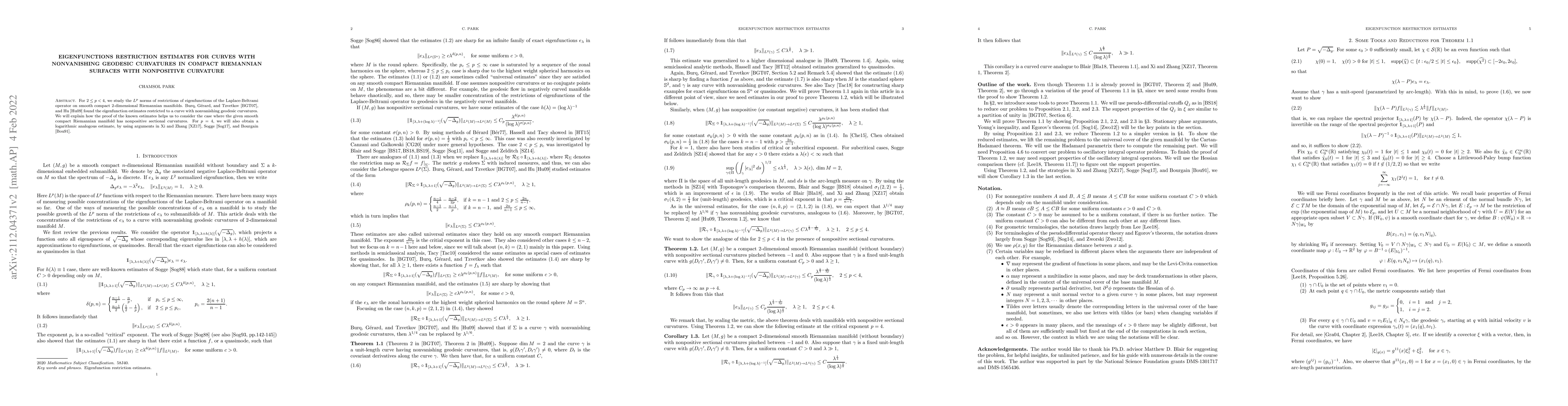 For $2\leq p<4$, we study the $L^p$ norms of restrictions of eigenfunctions of the Laplace-Beltrami operator on smooth compact $2$-dimensional Riemannian manifolds. Burq, G\'erard, and Tzvetkov \cite{BurqGerardTzvetkov2007restrictions}, and Hu \cite{Hu2009lp} found the eigenfunction estimates restricted to a curve with nonvanishing geodesic curvatures. We will explain how the proof of the known estimates helps us to consider the case where the given smooth compact Riemannian manifold has nonpositive sectional curvatures. For $p=4$, we will also obtain a logarithmic analogous estimate, by using arguments in Xi and Zhang \cite{XiZhang2017improved}, Sogge \cite{Sogge2017ImprovedCritical}, and Bourgain \cite{Bourgain1991Besicovitch}.