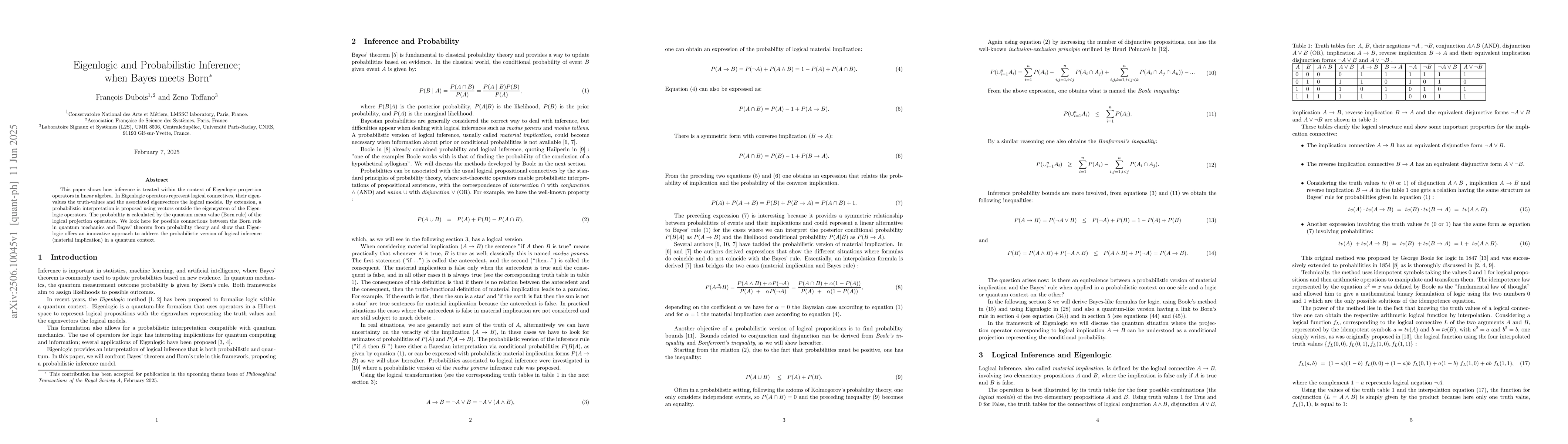 This paper shows how inference is treated within the context of Eigenlogic projection operators in linear algebra. In Eigenlogic operators represent logical connectives, their eigenvalues the truth-values and the associated eigenvectors the logical models. By extension, a probabilistic interpretation is proposed using vectors outside the eigensystem of the Eigenlogic operators. The probability is calculated by the quantum mean value (Born rule) of the logical projection operators. We look here for possible connections between the Born rule in quantum mechanics and Bayes' theorem from probability theory and show that Eigenlogic offers an innovative approach to address the probabilistic version of logical inference (material implication) in a quantum context.