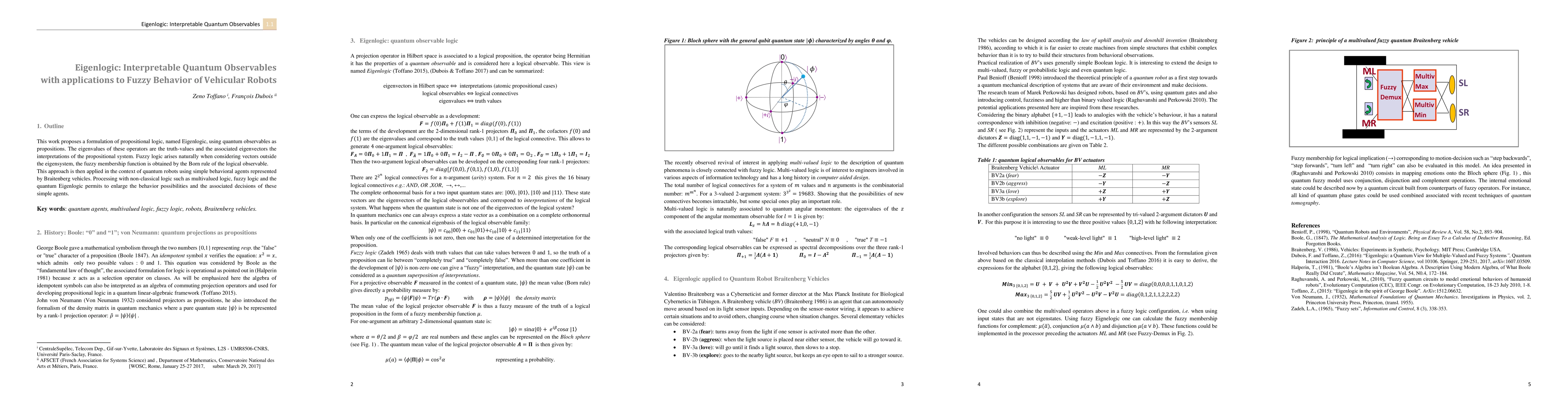 This work proposes a formulation of propositional logic, named Eigenlogic, using quantum observables as propositions. The eigenvalues of these operators are the truth-values and the associated eigenvectors the interpretations of the propositional system. Fuzzy logic arises naturally when considering vectors outside the eigensystem, the fuzzy membership function is obtained by the Born rule of the logical observable.This approach is then applied in the context of quantum robots using simple behavioral agents represented by Braitenberg vehicles. Processing with non-classical logic such as multivalued logic, fuzzy logic and the quantum Eigenlogic permits to enlarge the behavior possibilities and the associated decisions of these simple agents.