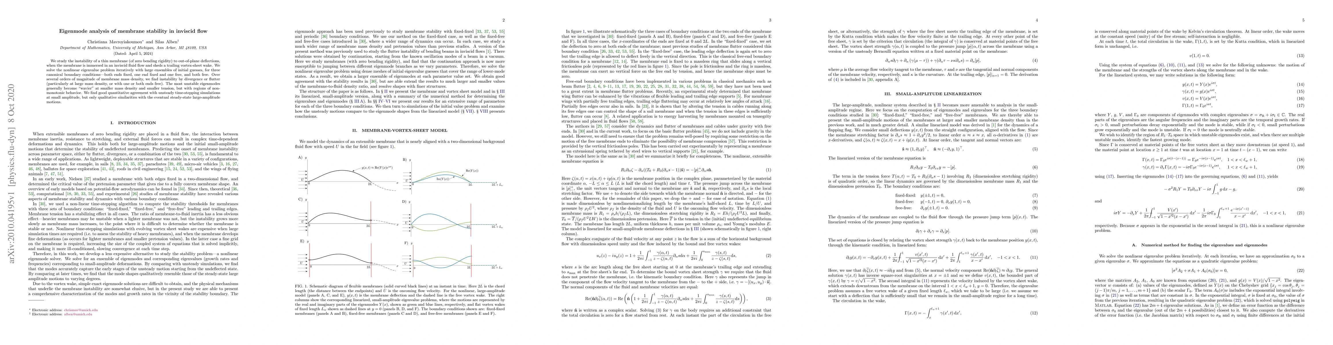 This paper investigates the instability of a thin membrane in inviscid fluid flow, focusing on out-of-plane deflections and trailing vortex-sheet wakes. It finds that instability occurs through divergence or flutter, especially at high mass density or with free ends, and shows complex behavior in eigenmodes across varying mass density and tension.
