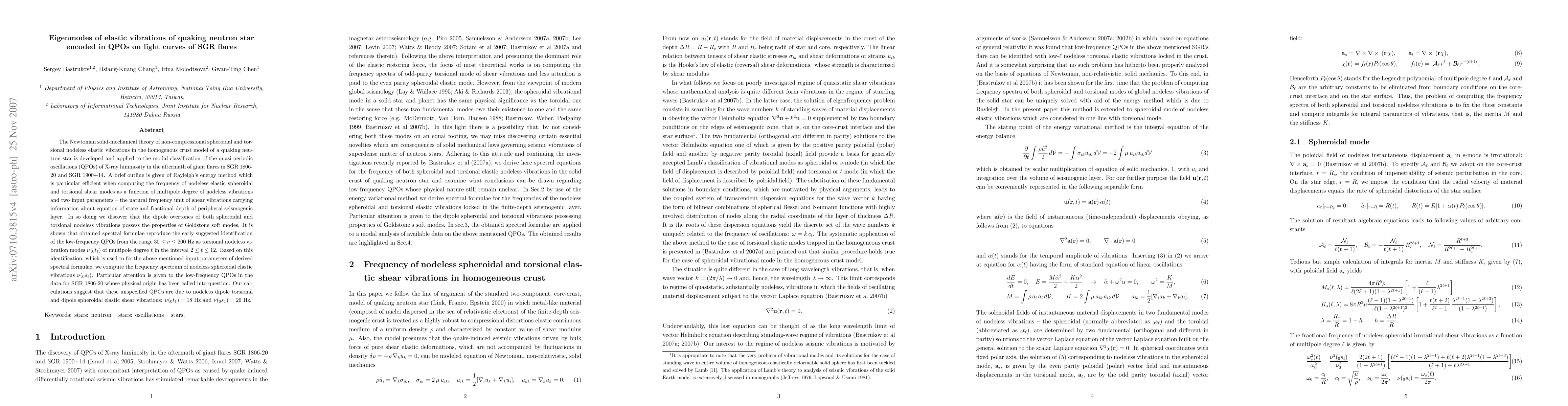 This paper explores the elastic vibrations in the crust of quaking neutron stars, linking quasi-periodic oscillations (QPOs) in X-ray light curves of SGR flares to these vibrations. It identifies low-frequency QPOs in SGR 1806-20 as nodeless dipole torsional and spheroidal elastic vibrations.