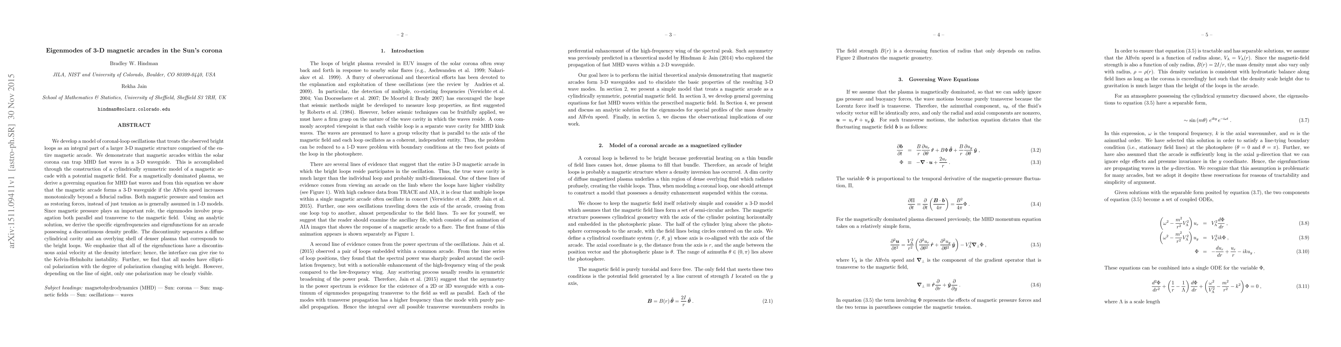 We develop a model of coronal-loop oscillations that treats the observed bright loops as an integral part of a larger 3-D magnetic structure comprised of the entire magnetic arcade. We demonstrate that magnetic arcades within the solar corona can trap MHD fast waves in a 3-D waveguide. This is accomplished through the construction of a cylindrically symmetric model of a magnetic arcade with a potential magnetic field. For a magnetically dominated plasma, we derive a governing equation for MHD fast waves and from this equation we show that the magnetic arcade forms a 3-D waveguide if the Alfv\'en speed increases monotonically beyond a fiducial radius. Both magnetic pressure and tension act as restoring forces, instead of just tension as is generally assumed in 1-D models. Since magnetic pressure plays an important role, the eigenmodes involve propagation both parallel and transverse to the magnetic field. Using an analytic solution, we derive the specific eigenfrequencies and eigenfunctions for an arcade possessing a discontinuous density profile. The discontinuity separates a diffuse cylindrical cavity and an overlying shell of denser plasma that corresponds to the bright loops. We emphasize that all of the eigenfunctions have a discontinuous axial velocity at the density interface; hence, the interface can give rise to the Kelvin-Helmholtz instability. Further, we find that all modes have elliptical polarization with the degree of polarization changing with height. However, depending on the line of sight, only one polarization may be clearly visible.
