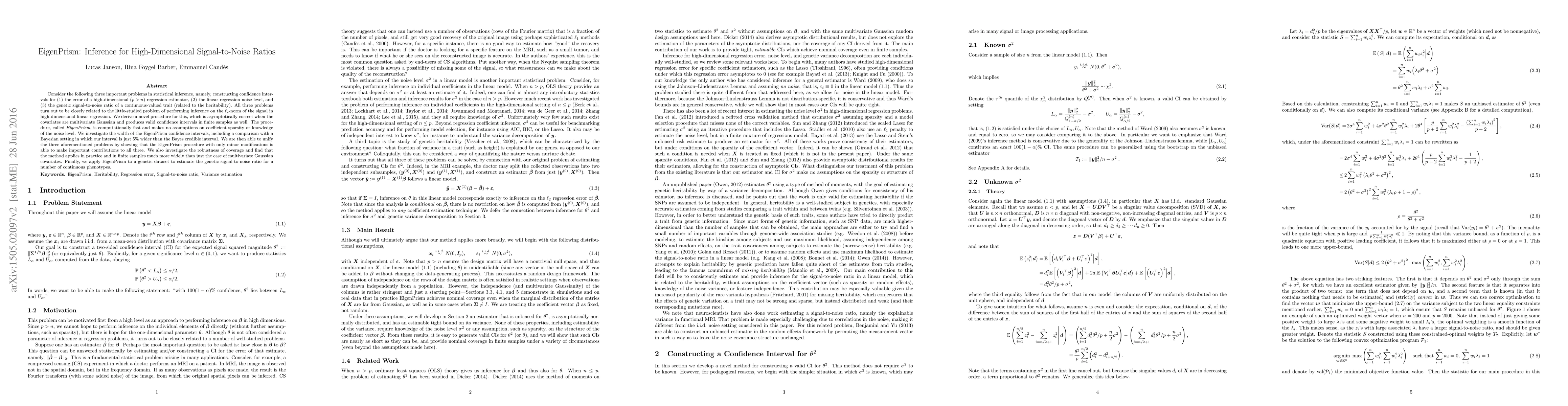 EigenPrism is a novel procedure for constructing confidence intervals for high-dimensional signal-to-noise ratios, including error estimation in regression, noise level in linear regression, and genetic heritability. It is computationally efficient and applicable beyond multivariate Gaussian covariates, showing robustness and minor modifications for diverse inference problems.