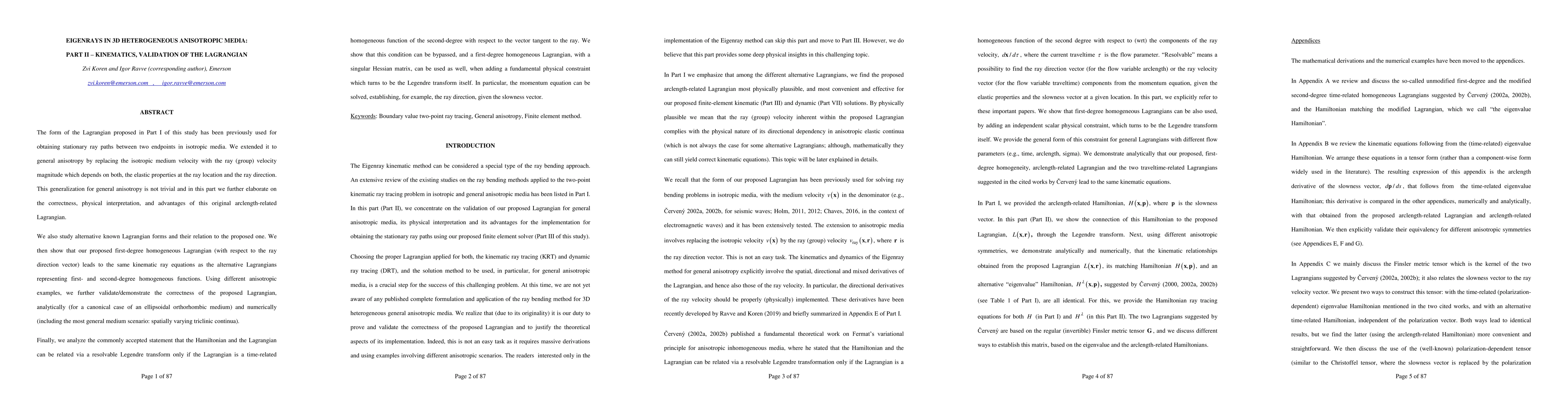 The form of the Lagrangian proposed in Part I of this study has been previously used for obtaining stationary ray paths between two endpoints in isotropic media. We extended it to general anisotropy by replacing the isotropic medium velocity with the ray (group) velocity magnitude which depends on both, the elastic properties at the ray location and the ray direction. This generalization for general anisotropy is not trivial and in this part we further elaborate on the correctness, physical interpretation, and advantages of this original arclength-related Lagrangian. We also study alternative known Lagrangian forms and their relation to the proposed one. We then show that our proposed first-degree homogeneous Lagrangian (with respect to the ray direction vector) leads to the same kinematic ray equations as the alternative Lagrangians representing first- and second-degree homogeneous functions. Using different anisotropic examples, we further validate/demonstrate the correctness of the proposed Lagrangian, analytically (for a canonical case of an ellipsoidal orthorhombic medium) and numerically (including the most general medium scenario: spatially varying triclinic continua). Finally, we analyze the commonly accepted statement that the Hamiltonian and the Lagrangian can be related via a resolvable Legendre transform only if the Lagrangian is a time-related homogeneous function of the second-degree with respect to the vector tangent to the ray. We show that this condition can be bypassed, and a first-degree homogeneous Lagrangian, with a singular Hessian matrix, can be used as well, when adding a fundamental physical constraint which turns to be the Legendre transform itself. In particular, the momentum equation can be solved, establishing, for example, the ray direction, given the slowness vector.