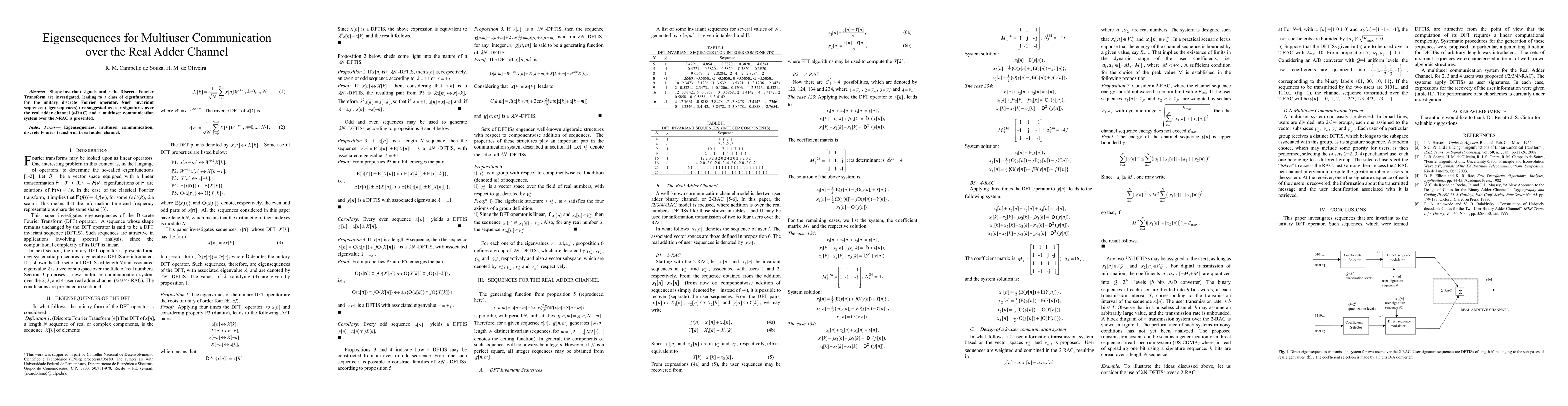 Shape-invariant signals under the Discrete Fourier Transform are investigated, leading to a class of eigenfunctions for the unitary discrete Fourier operator. Such invariant sequences (eigensequences) are suggested as user signatures over the real adder channel (t-RAC) and a multiuser communication system over the t-RAC is presented.