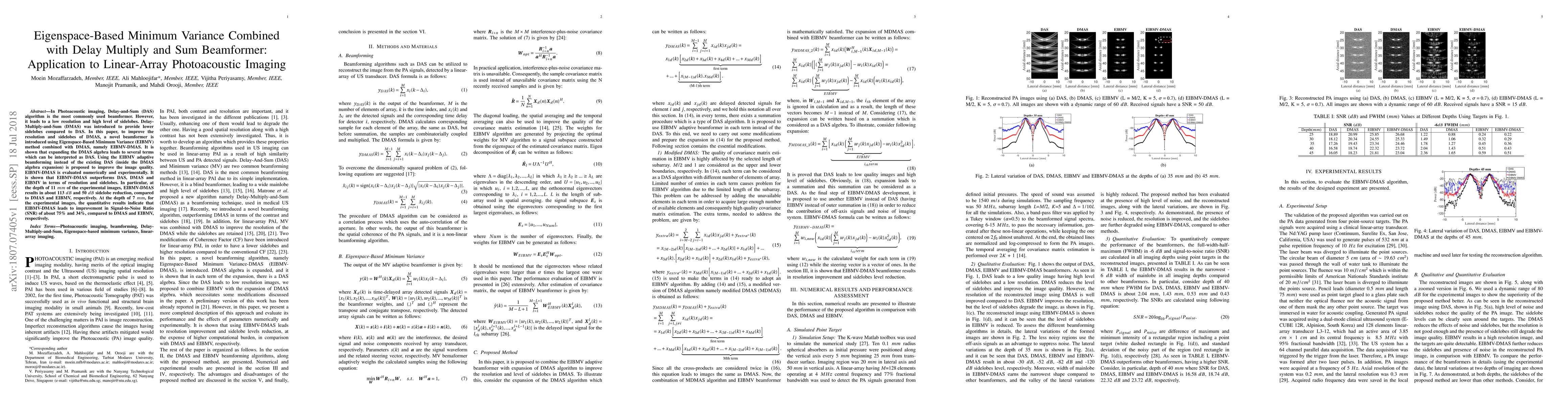 This paper introduces a novel EIBMV-DMAS beamformer combining Eigenspace-Based Minimum Variance with Delay-Multiply-and-Sum for photoacoustic imaging, achieving superior resolution and sidelobe reduction compared to traditional DAS and DMAS methods. Experimental results show significant improvements in SNR and sidelobe levels.