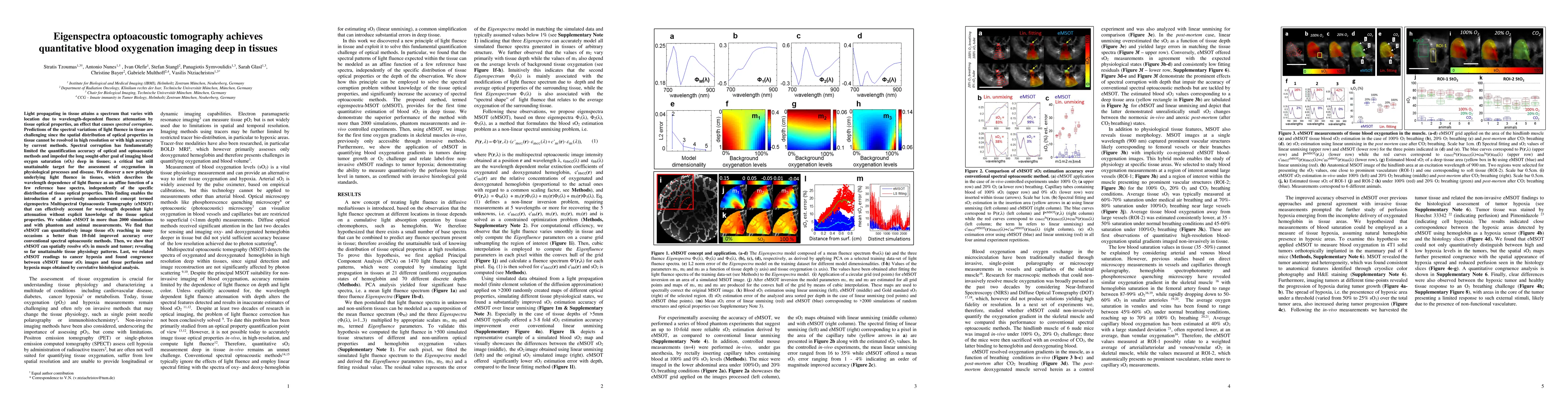 This research introduces eigenspectra Multispectral Optoacoustic Tomography (eMSOT), a novel method that achieves quantitative blood oxygenation imaging deep in tissues by modeling light fluence as an affine function of reference base spectra, thus overcoming the limitations of spectral corruption. eMSOT demonstrates significantly improved accuracy over conventional methods and reveals physiological patterns in muscle and tumor tissues.