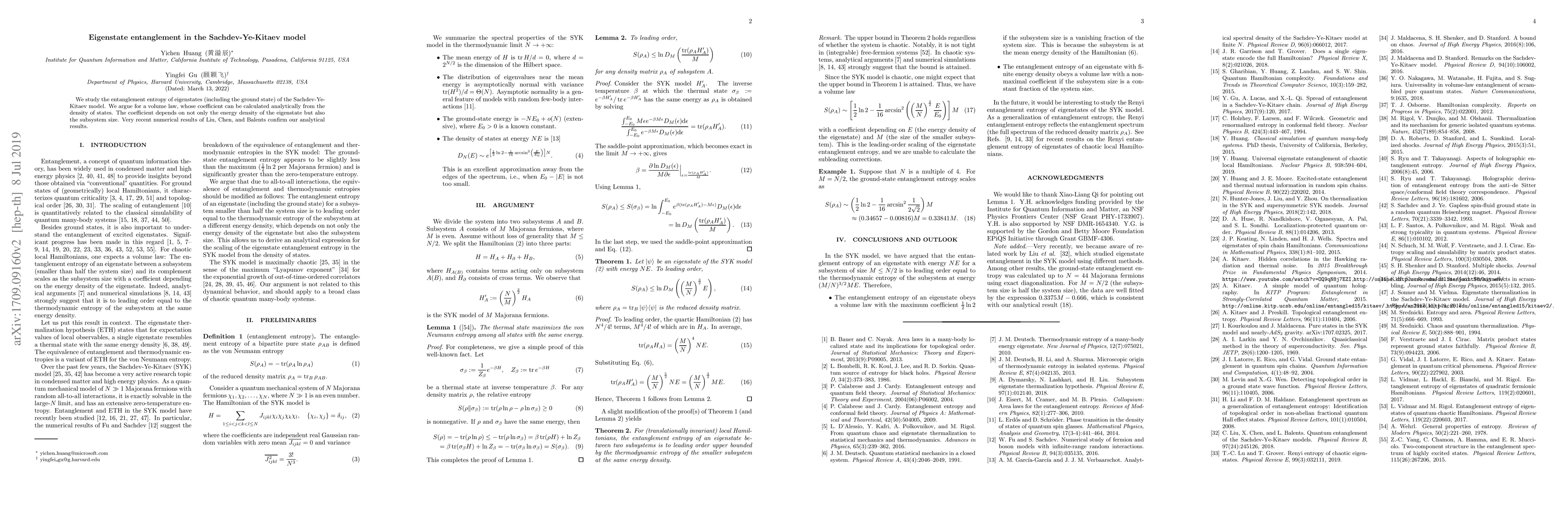 This paper investigates the entanglement entropy of eigenstates in the Sachdev-Ye-Kitaev model, proposing a volume law with a coefficient analytically determined from the density of states, which varies with both subsystem size and energy density. Recent numerical results corroborate the theoretical findings.