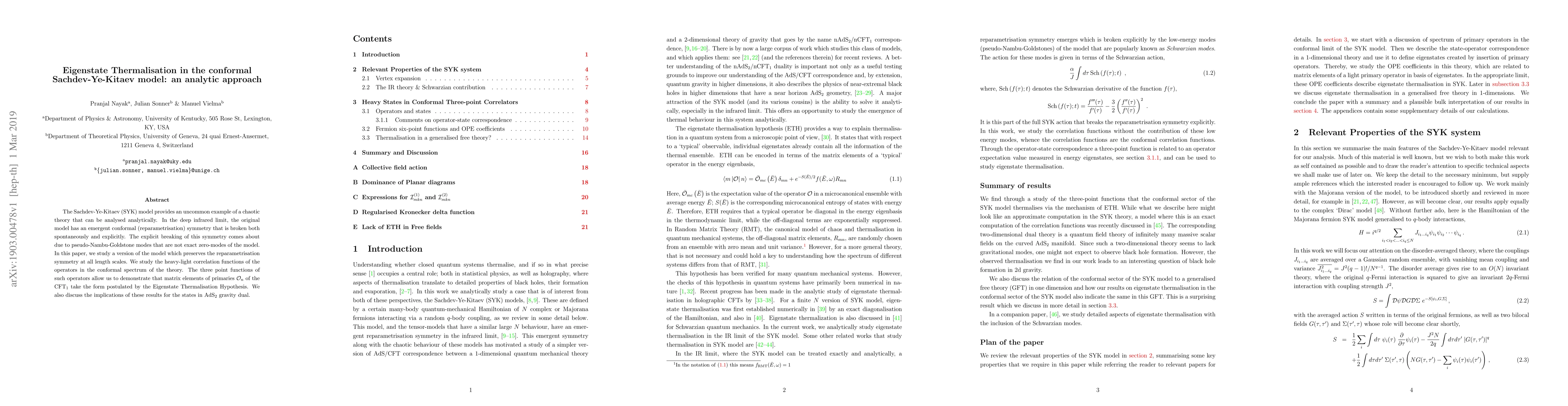 The Sachdev-Ye-Kitaev (SYK) model provides an uncommon example of a chaotic theory that can be analysed analytically. In the deep infrared limit, the original model has an emergent conformal (reparametrisation) symmetry that is broken both spontaneously and explicitly. The explicit breaking of this symmetry comes about due to pseudo-Nambu-Goldstone modes that are not exact zero-modes of the model. In this paper, we study a version of the model which preserves the reparametrisation symmetry at all length scales. We study the heavy-light correlation functions of the operators in the conformal spectrum of the theory. The three point functions of such operators allow us to demonstrate that matrix elements of primaries ${\cal O}_n$ of the CFT$_1$ take the form postulated by the Eigenstate Thermalisation Hypothesis. We also discuss the implications of these results for the states in AdS$_2$ gravity dual.
