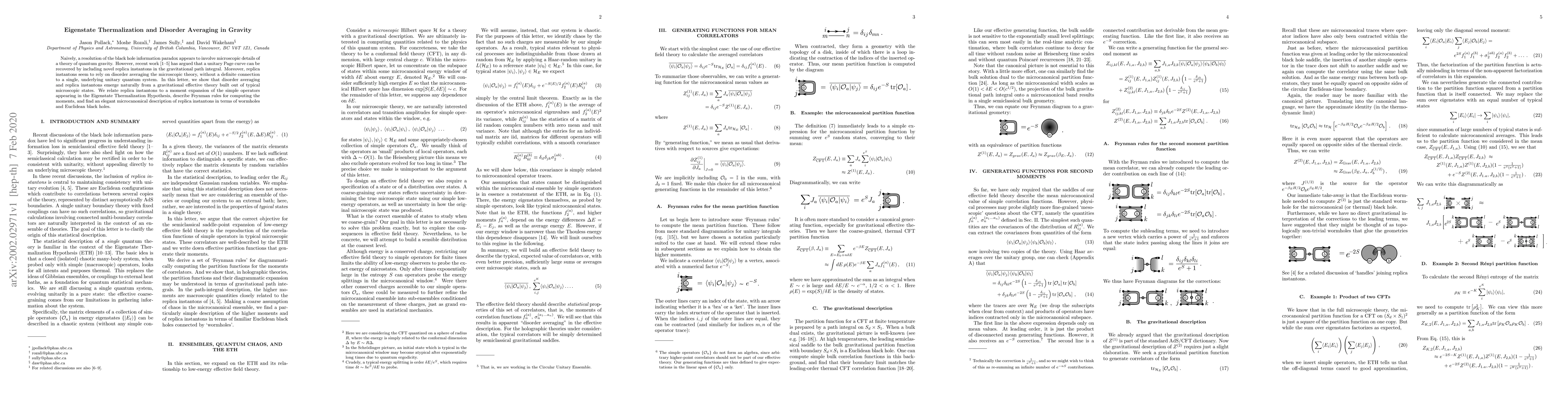 This paper explores how disorder averaging and replica instantons naturally arise in a gravitational effective theory constructed from typical microscopic states, providing a unitary Page curve for the black hole information paradox and linking these concepts to the Eigenstate Thermalization Hypothesis through a moment expansion. The study also offers a microcanonical description of replica instantons in terms of wormholes and Euclidean black holes.