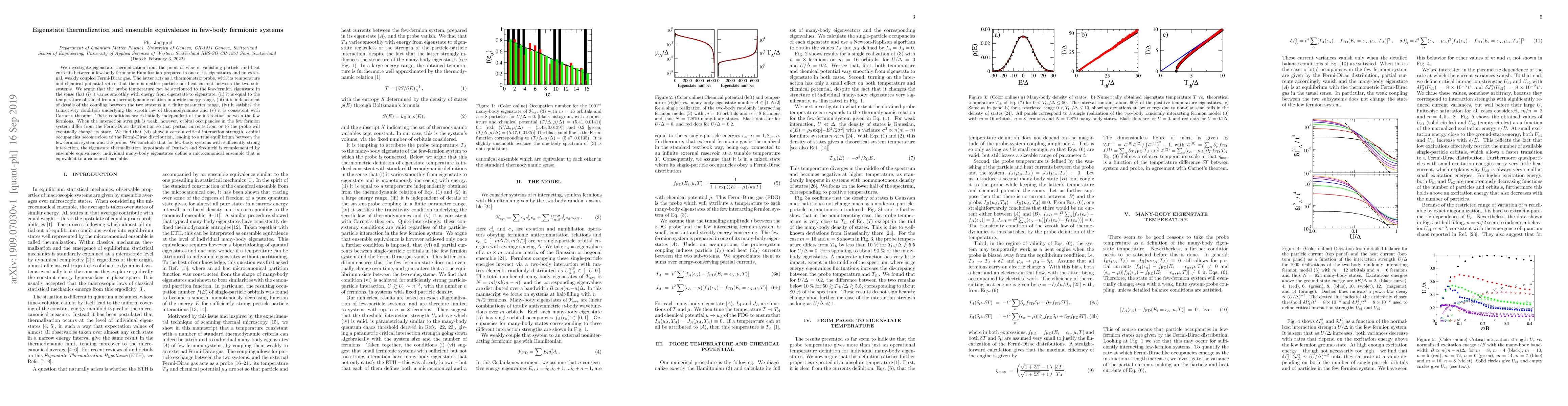 We investigate eigenstate thermalization from the point of view of vanishing particle and heat currents between a few-body fermionic Hamiltonian prepared in one of its eigenstates and an external, weakly coupled Fermi-Dirac gas. The latter acts as a thermometric probe, with its temperature and chemical potential set so that there is neither particle nor heat current between the two subsystems. We argue that the probe temperature can be attributed to the few-fermion eigenstate in the sense that (i) it varies smoothly with energy from eigenstate to eigenstate, (ii) it is equal to the temperature obtained from a thermodynamic relation in a wide energy range, (iii) it is independent of details of the coupling between the two systems in a finite parameter range, (iv) it satisfies the transitivity condition underlying the zeroth law of thermodynamics and (v) it is consistent with Carnot's theorem. These conditions are essentially independent of the interaction between the few fermions. When the interaction strength is weak, however, orbital occupancies in the few fermion system differ from the Fermi-Dirac distribution so that partial currents from or to the probe will eventually change its state. We find that (vi) above a certain critical interaction strength, orbital occupancies become close to the Fermi-Dirac distribution, leading to a true equilibrium between the few-fermion system and the probe. We conclude that for few-body systems with sufficiently strong interaction, the eigenstate thermalization hypothesis of Deutsch and Srednicki is complemented by ensemble equivalence: individual many-body eigenstates define a microcanonical ensemble that is equivalent to a canonical ensemble.
