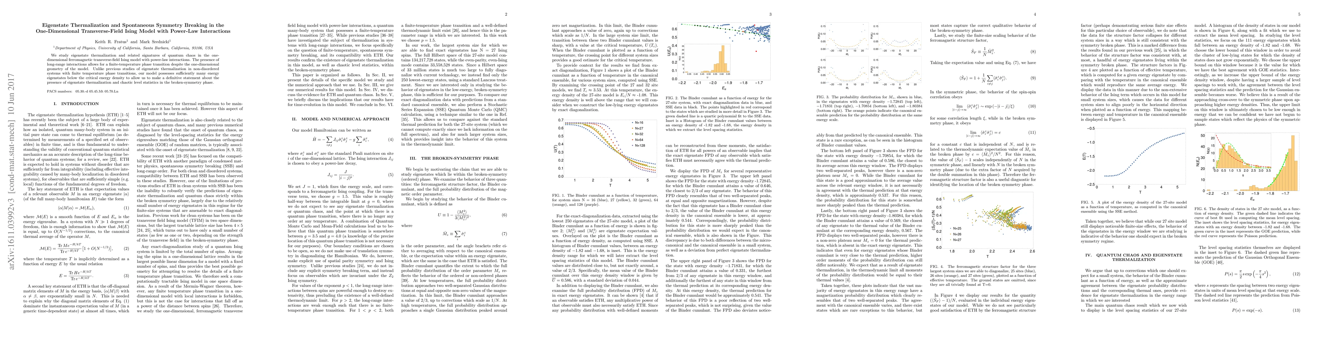 This paper investigates eigenstate thermalization and quantum chaos in a one-dimensional transverse-field Ising model with power-law interactions, revealing a finite-temperature phase transition due to long-range interactions. It confirms the presence of eigenstate thermalization and chaotic level statistics in the broken-symmetry phase, distinguishing it from non-disordered systems with similar transitions.
