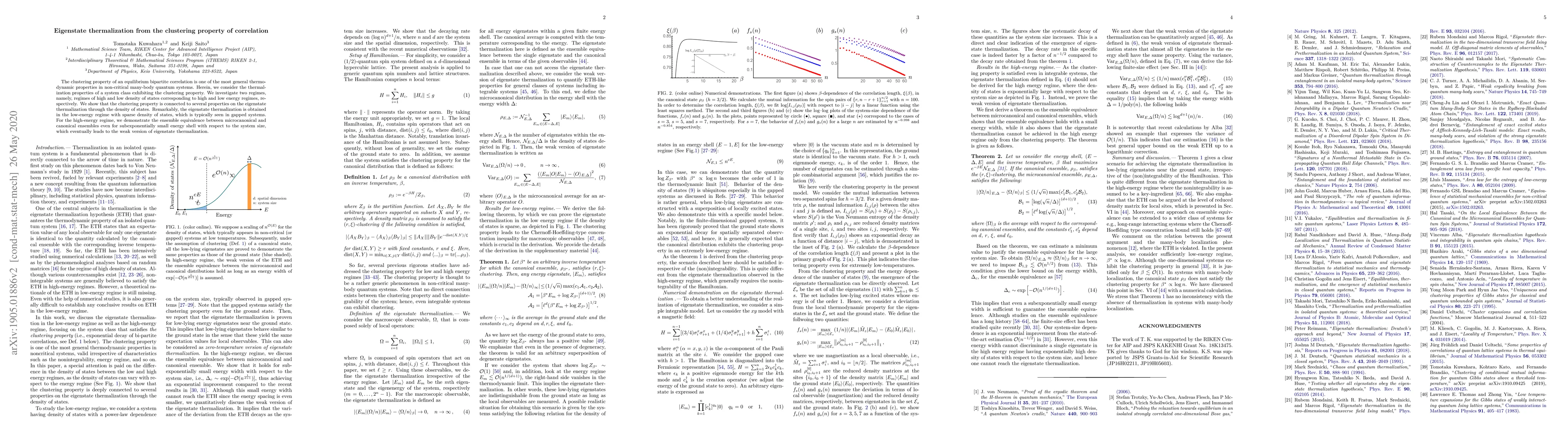 This paper explores the connection between the clustering property of equilibrium bipartite correlations and eigenstate thermalization in non-critical many-body quantum systems. It finds that eigenstate thermalization occurs in low-energy regimes with sparse density of states, while in high-energy regimes, ensemble equivalence between microcanonical and canonical ensembles leads to a weak version of eigenstate thermalization.