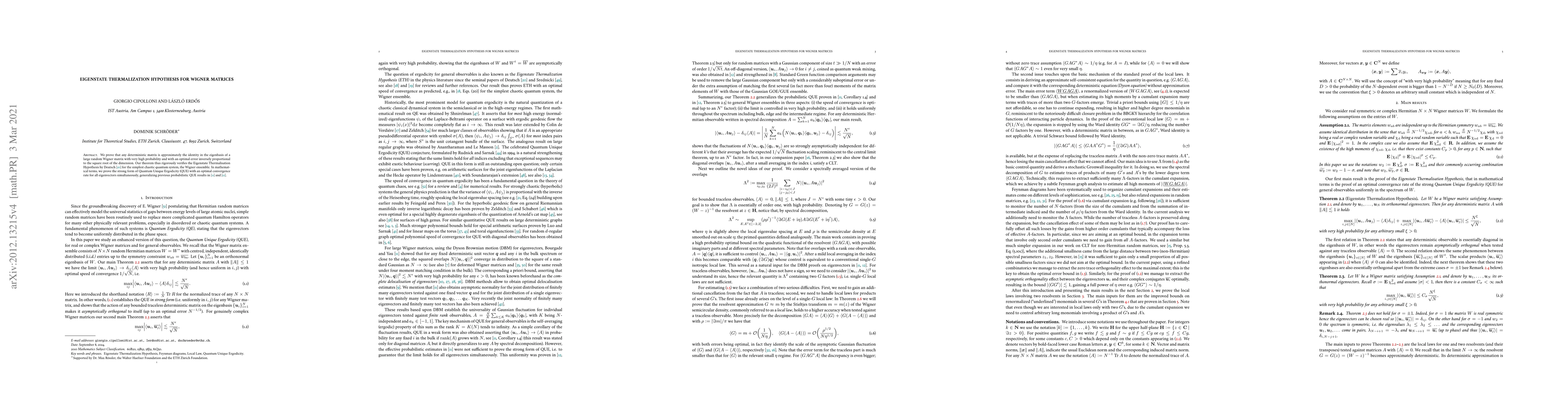 This paper proves that deterministic matrices resemble the identity matrix in the eigenbasis of large random Wigner matrices, verifying the Eigenstate Thermalization Hypothesis for chaotic quantum systems. The authors achieve optimal error convergence rates, rigorously establishing the strong form of Quantum Unique Ergodicity for all eigenvectors simultaneously.