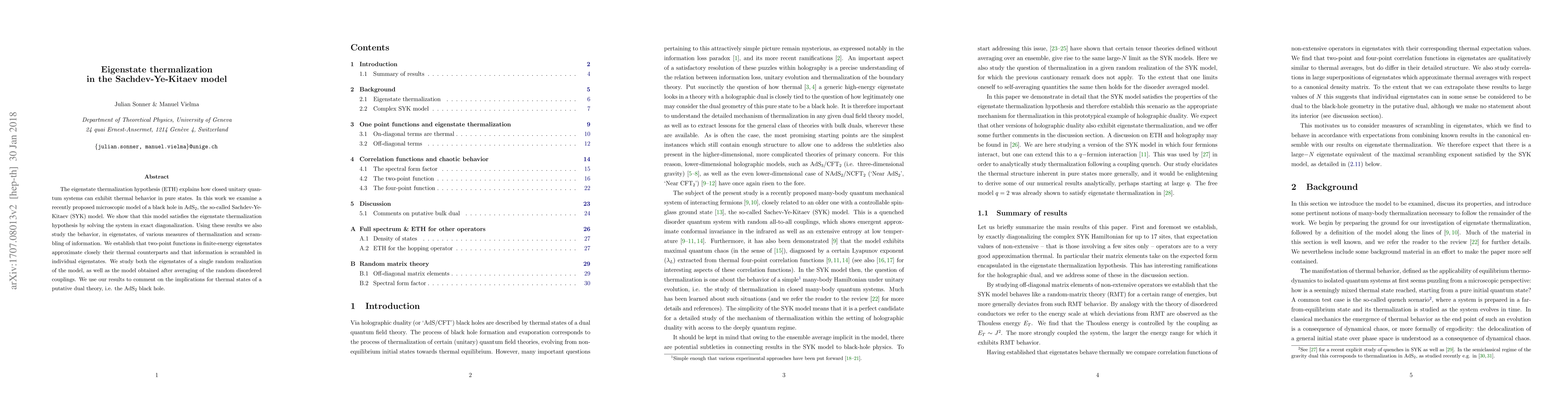 This research demonstrates that the Sachdev-Ye-Kitaev (SYK) model adheres to the eigenstate thermalization hypothesis, showing thermal behavior in pure states and scrambling of information in eigenstates. These findings provide insights into the thermal states of the dual AdS$_2$ black hole theory.