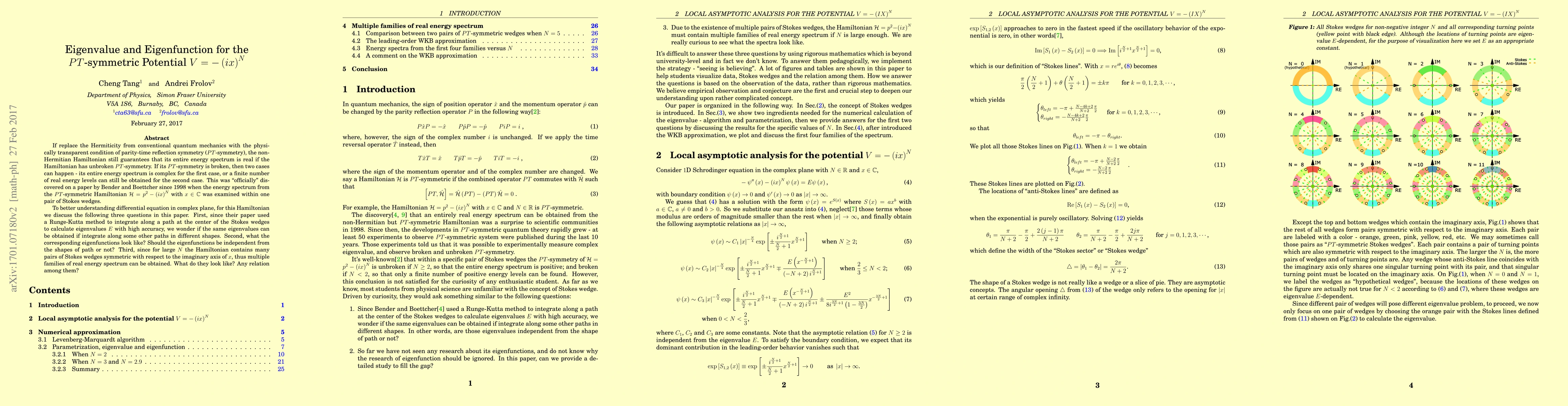This paper investigates the $PT$-symmetric Hamiltonian $H = p^2 - (ix)^N$, exploring eigenvalues and eigenfunctions within various path shapes in Stokes wedges, and analyzing multiple real energy spectrum families for large N, finding potential path-independence in eigenfunctions and symmetric spectrum relationships.