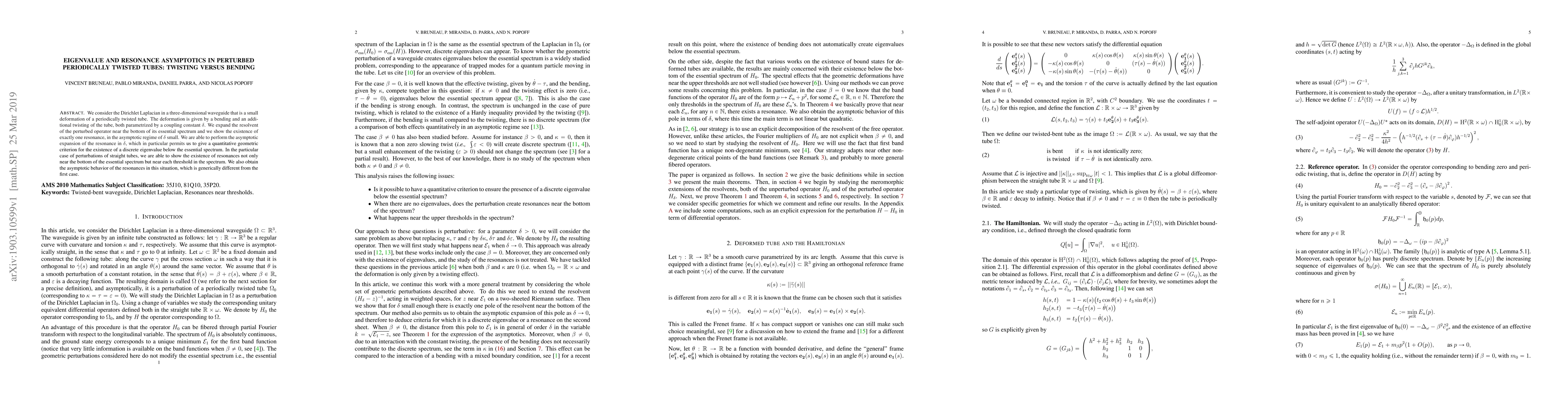 This paper studies the Dirichlet Laplacian in a periodically twisted tube undergoing small bending and twisting deformations. It reveals the existence of a single resonance near the essential spectrum for small deformations and provides an asymptotic expansion for the resonance, establishing a geometric criterion for discrete eigenvalues. For straight tube perturbations, it finds resonances near various spectral thresholds with distinct asymptotic behavior.