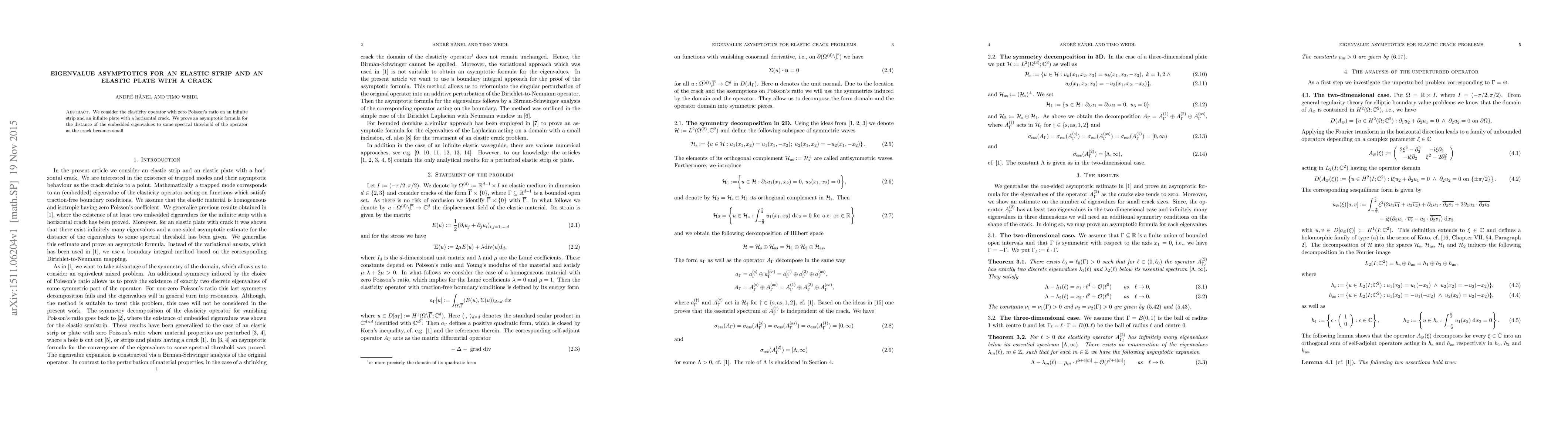 This paper investigates the eigenvalue distribution of an elasticity operator on an infinite strip and plate with a small horizontal crack, proving an asymptotic formula for the eigenvalue spacing as the crack size approaches zero. The study focuses on the case with zero Poisson's ratio.