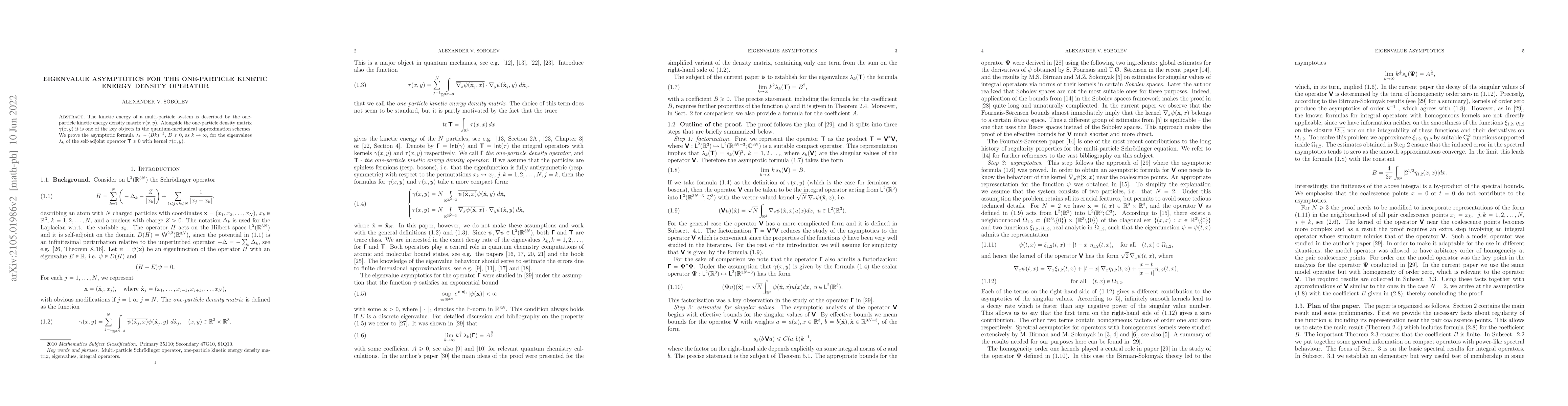 This paper investigates the asymptotic behavior of the eigenvalues of the one-particle kinetic energy density operator in quantum mechanics. The authors prove that the eigenvalues $\lambda_k$ asymptotically scale as $\lambda_k \sim (Bk)^{-2}$ for large $k$, where $B \ge 0$ is a constant.
