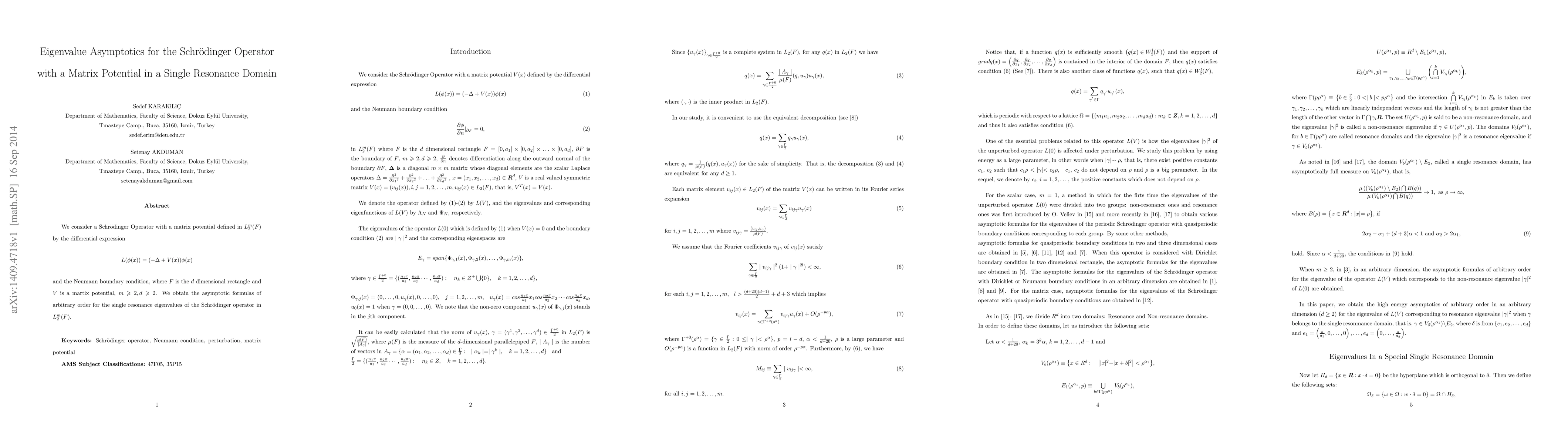 We consider a Schr\"odinger Operator with a matrix potential defined in $L_2^m(F)$ by the differential expression\begin{equation*} L(\phi(x))=(-\Delta+V(x))\phi(x) \end{equation*}and the Neumann boundary condition, where $F$ is the $d$ dimensional rectangle and $V$ is a martix potential, $m\geqslant 2, d\geqslant 2$. We obtain the asymptotic formulas of arbitrary order for the single resonance eigenvalues of the Schr\"odinger operator in $L_2^m(F)$.