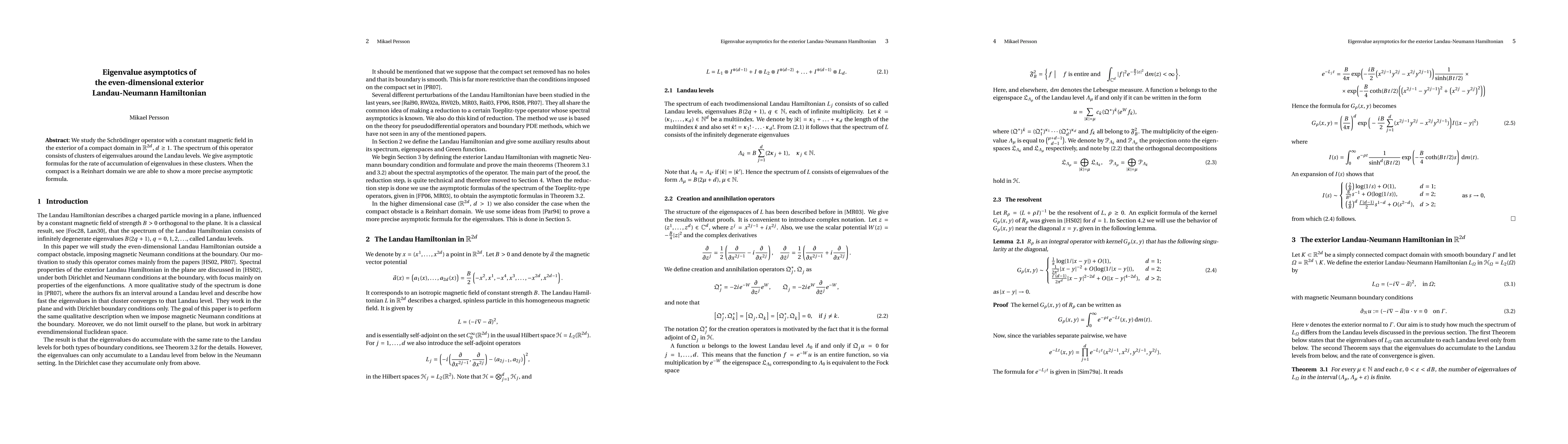 We study the Schroedinger operator with a constant magnetic field in the exterior of a compact domain in $\mathbb{R}^{2d}$, $d\geq 1$. The spectrum of this operator consists of clusters of eigenvalues around the Landau levels. We give asymptotic formulas for the rate of accumulation of eigenvalues in these clusters. When the compact is a Reinhart domain we are able to show a more precise asymptotic formula.