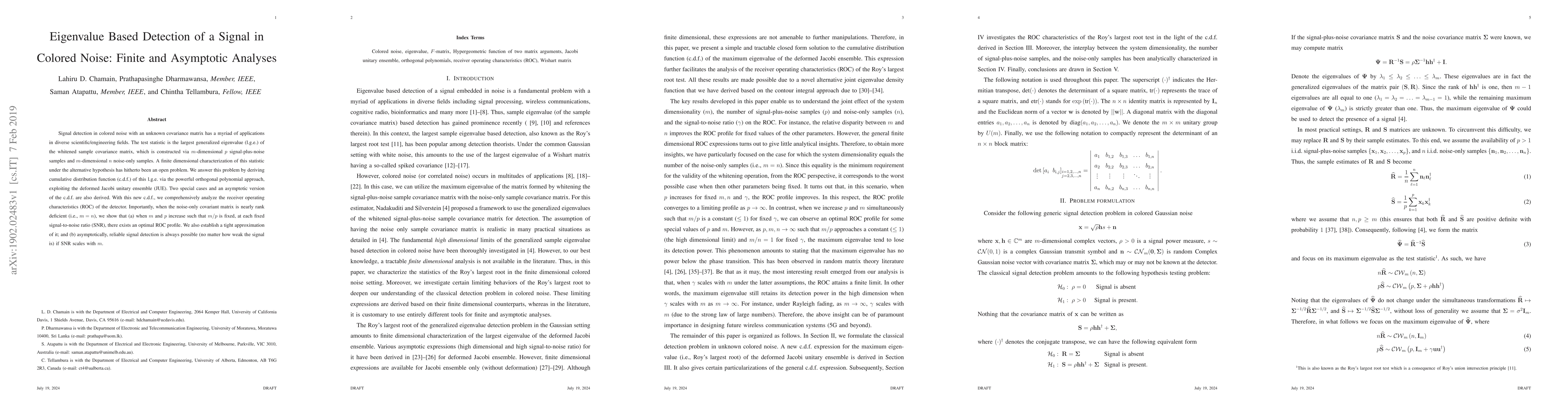 Signal detection in colored noise with an unknown covariance matrix has a myriad of applications in diverse scientific/engineering fields. The test statistic is the largest generalized eigenvalue (l.g.e.) of the whitened sample covariance matrix, which is constructed via $m$-dimensional $p $ signal-plus-noise samples and $m$-dimensional $n $ noise-only samples. A finite dimensional characterization of this statistic under the alternative hypothesis has hitherto been an open problem. We answer this problem by deriving cumulative distribution function (c.d.f.) of this l.g.e. via the powerful orthogonal polynomial approach, exploiting the deformed Jacobi unitary ensemble (JUE). Two special cases and an asymptotic version of the c.d.f. are also derived. With this new c.d.f., we comprehensively analyze the receiver operating characteristics (ROC) of the detector. Importantly, when the noise-only covariant matrix is nearly rank deficient (i.e., $ m=n$), we show that (a) when $m$ and $p$ increase such that $m/p$ is fixed, at each fixed signal-to-noise ratio (SNR), there exists an optimal ROC profile. We also establish a tight approximation of it; and (b) asymptotically, reliable signal detection is always possible (no matter how weak the signal is) if SNR scales with $m$.
