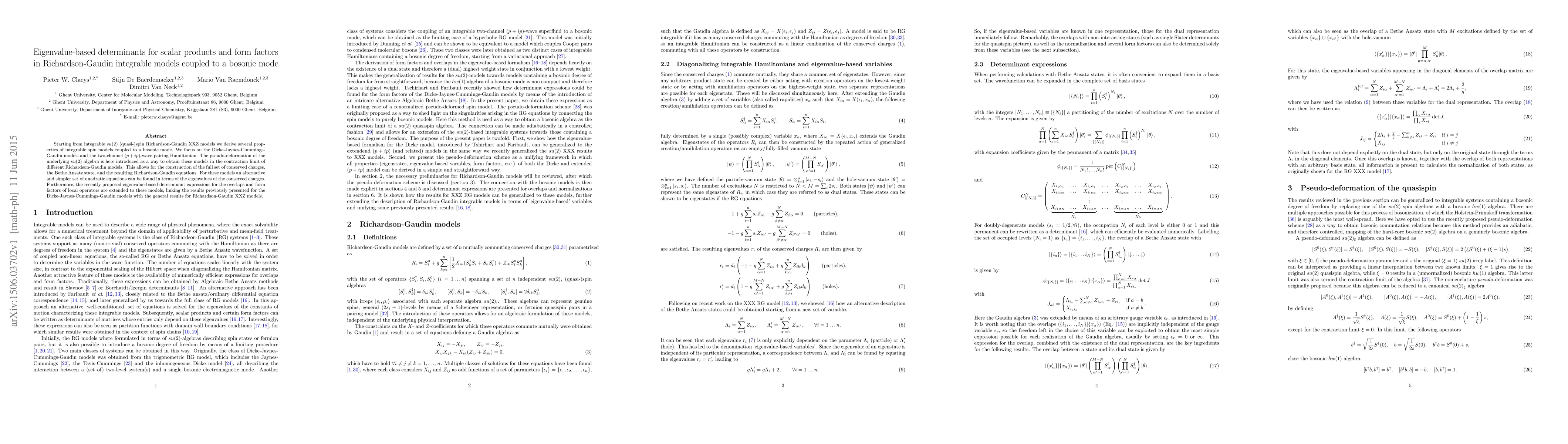This paper derives properties of integrable spin models coupled to a bosonic mode, focusing on the Dicke-Jaynes-Cummings-Gaudin models and $(p+ip)$-wave pairing Hamiltonian. It introduces a pseudo-deformation of the $su(2)$ algebra to construct conserved charges and Bethe Ansatz states, and extends eigenvalue-based determinant expressions for overlaps and form factors to these models.