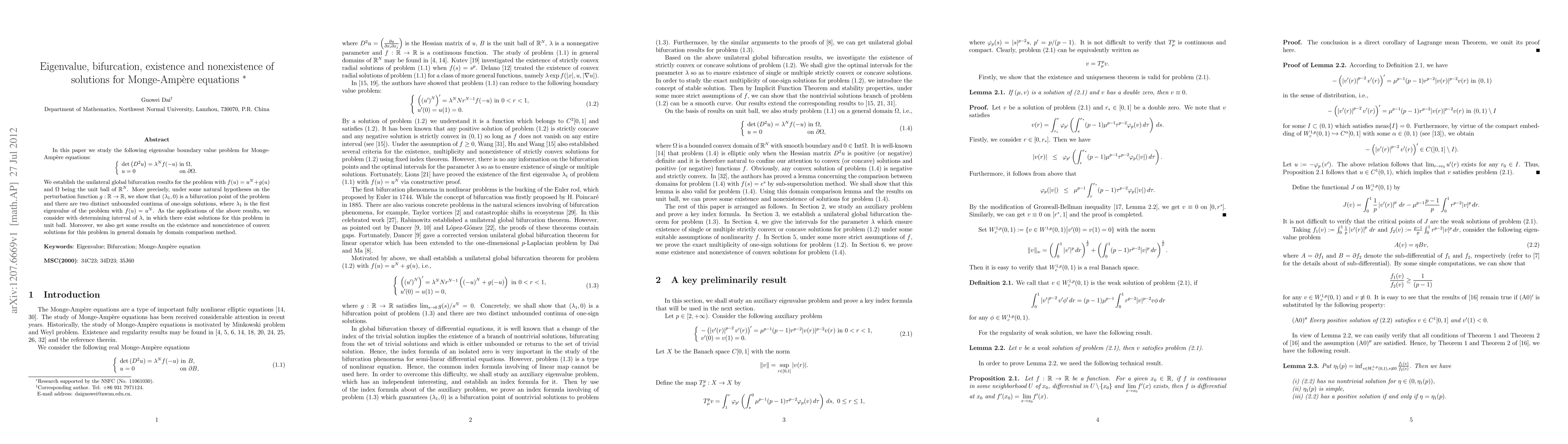 In this paper we study the following eigenvalue boundary value problem for Monge-Amp\`{e}re equations: {equation} \{{array}{l} \det(D^2u)=\lambda^N f(-u)\,\, \text{in}\,\, \Omega, u=0,\,\text{on}\,\, \partial \Omega. {array}. {equation} We establish the unilateral global bifurcation results for the problem with $f(u)=u^N+g(u)$ and $\Omega$ being the unit ball of $\mathbb{R}^N$. More precisely, under some natural hypotheses on the perturbation function $g:\mathbb{R}\rightarrow\mathbb{R}$, we show that $(\lambda_1,0)$ is a bifurcation point of the problem and there are two distinct unbounded continua of one-sign solutions, where $\lambda_1$ is the first eigenvalue of the problem with $f(u)=u^N$. As the applications of the above results, we consider with determining interval of $\lambda$, in which there exist solutions for this problem in unit ball. Moreover, we also get some results on the existence and nonexistence of convex solutions for this problem in general domain by domain comparison method.