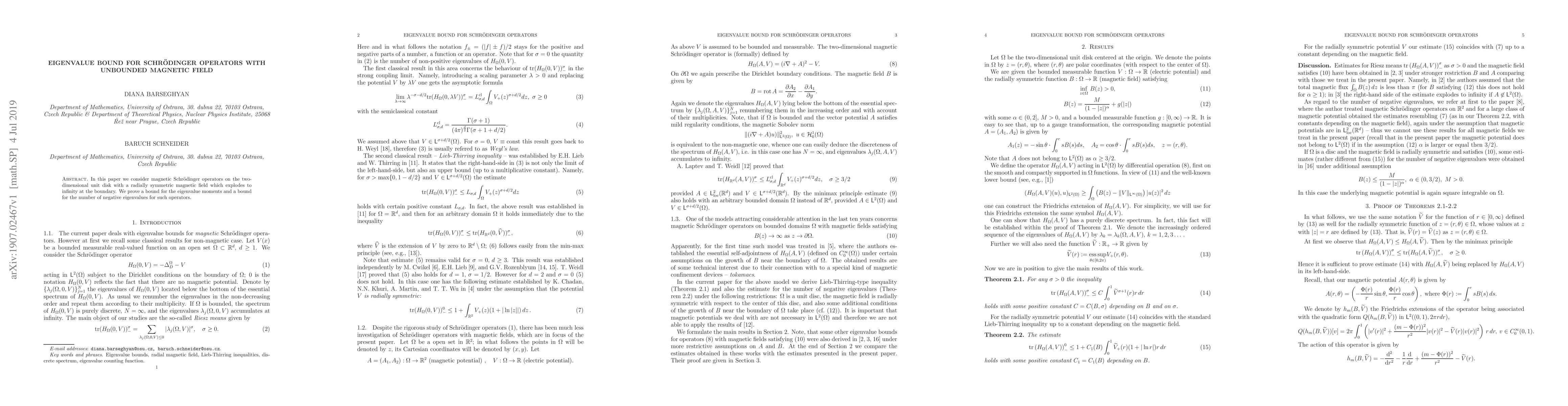 In this paper we consider magnetic Schroedinger operators on the two-dimensional unit disk with a radially symmetric magnetic field which explodes to infinity at the boundary. We prove a bound for the eigenvalue moments and a bound for the number of negative eigenvalues for such operators.
