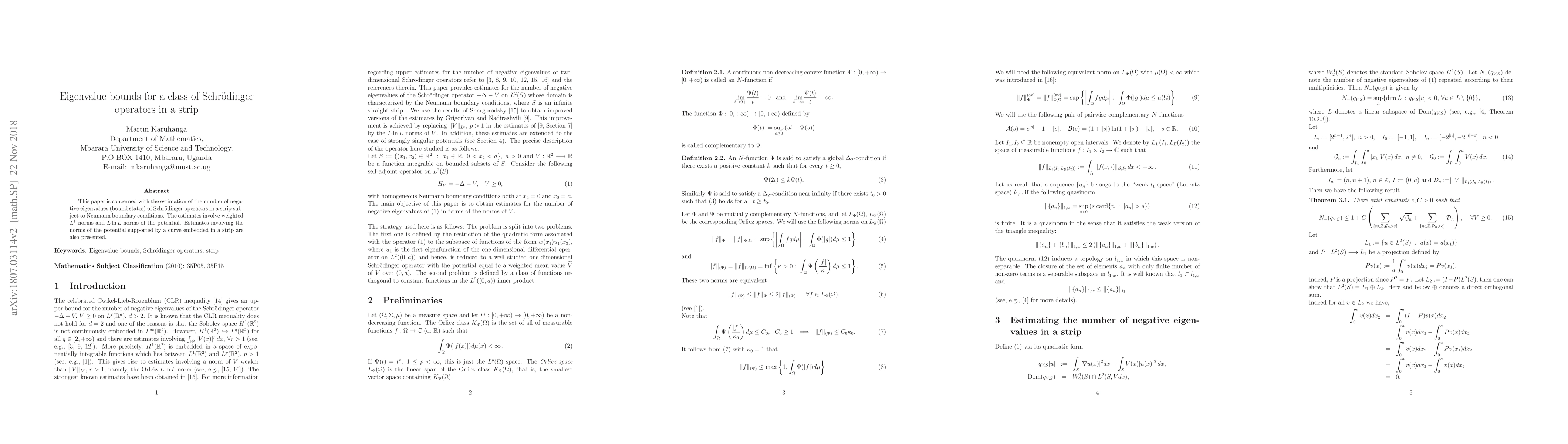 This paper estimates the number of negative eigenvalues of Schrödinger operators in a strip with Neumann boundary conditions, using weighted L^1 and L ln L norms of the potential, along with estimates based on potentials supported by an embedded curve.
