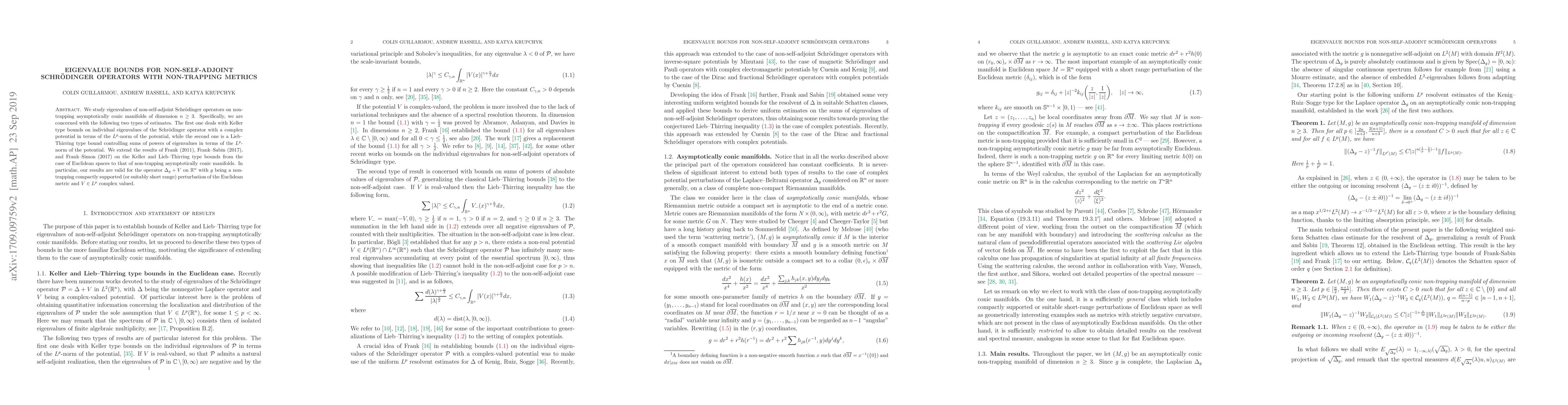 This paper investigates eigenvalue bounds for non-self-adjoint Schrödinger operators on non-trapping asymptotically conic manifolds, establishing Keller type bounds for individual eigenvalues and Lieb-Thirring type bounds for sums of powers of eigenvalues in terms of the potential's $L^p$-norm. The results extend previous findings from Euclidean spaces to these more general manifolds.